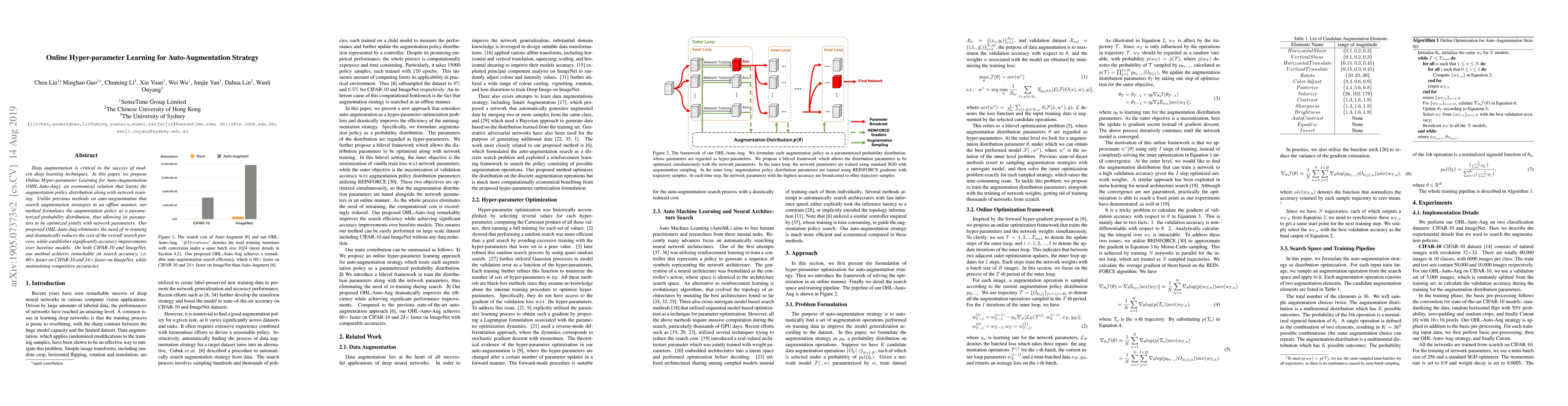 This paper introduces Online Hyper-parameter Learning for Auto-Augmentation (OHL-Auto-Aug), which optimizes the augmentation policy during training, eliminating the need for offline re-training and significantly reducing search costs. The method achieves notable accuracy improvements and is 60x faster on CIFAR-10 and 24x faster on ImageNet compared to baseline models.