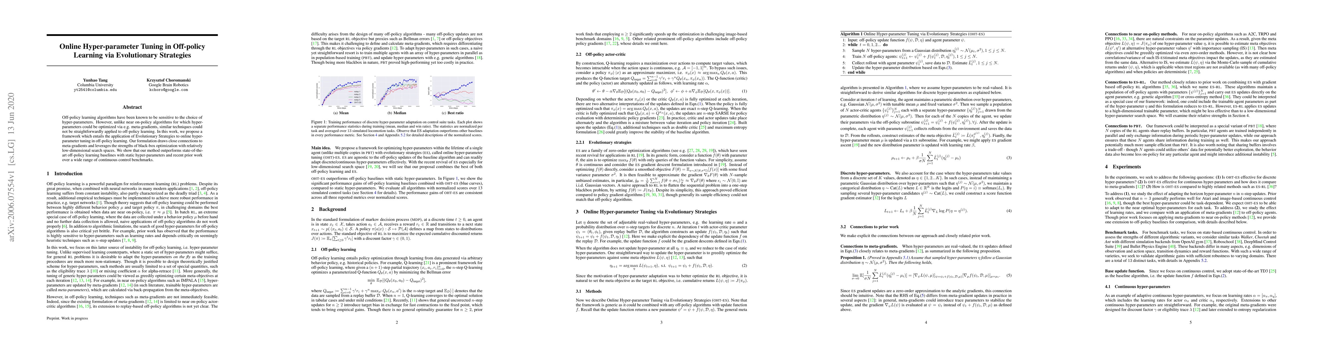 This paper proposes a framework using Evolutionary Strategies for online hyper-parameter tuning in off-policy learning, demonstrating superior performance over static hyper-parameter baselines and recent methods across various continuous control tasks. The approach leverages the strengths of black-box optimization for relatively low-dimensional search spaces.