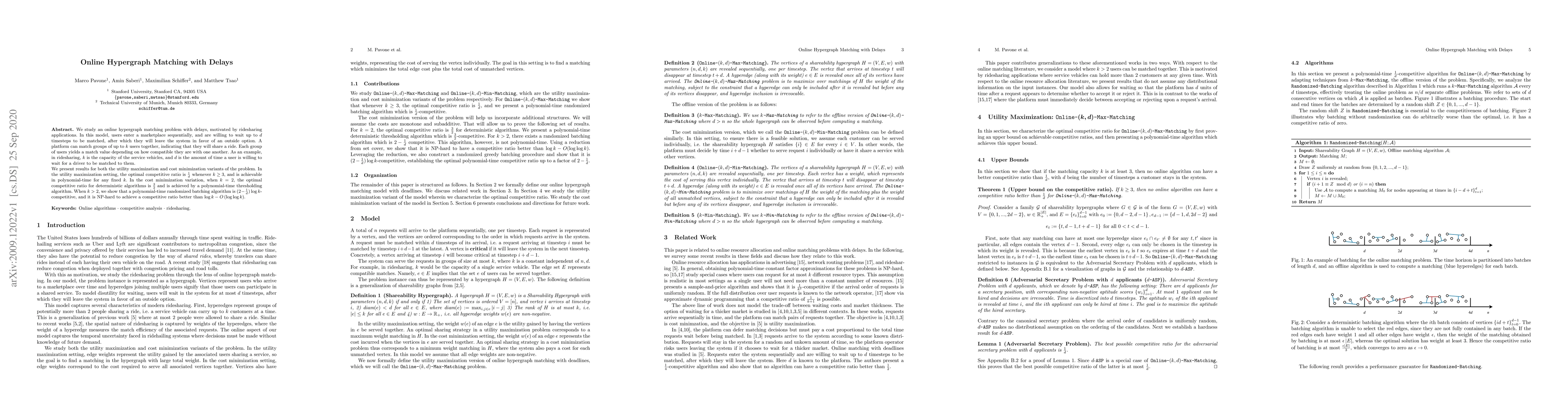 Researchers studied an online hypergraph matching problem with delays for ridesharing applications, finding optimal competitive ratios for utility maximization and cost minimization scenarios.