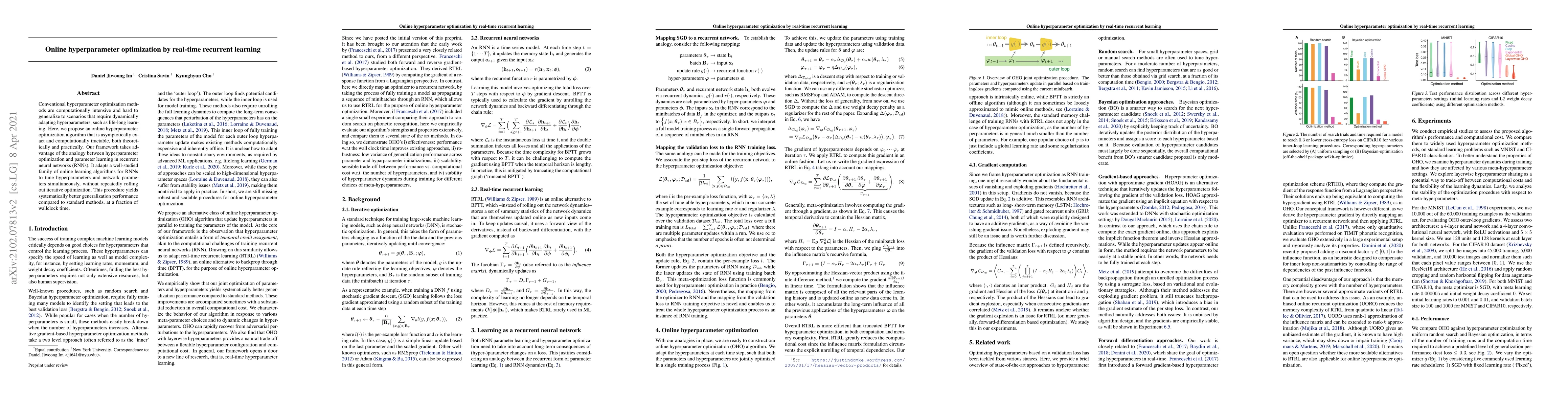 This paper proposes an online hyperparameter optimization algorithm leveraging real-time recurrent learning, which adapts online learning techniques for recurrent neural networks to tune hyperparameters dynamically. The method achieves better generalization and significantly reduces computational costs compared to conventional methods.