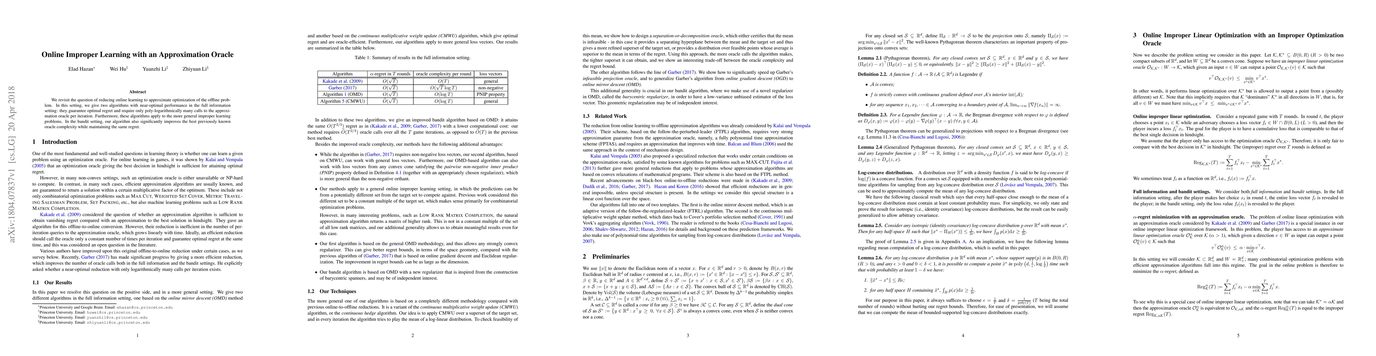 We revisit the question of reducing online learning to approximate optimization of the offline problem. In this setting, we give two algorithms with near-optimal performance in the full information setting: they guarantee optimal regret and require only poly-logarithmically many calls to the approximation oracle per iteration. Furthermore, these algorithms apply to the more general improper learning problems. In the bandit setting, our algorithm also significantly improves the best previously known oracle complexity while maintaining the same regret.