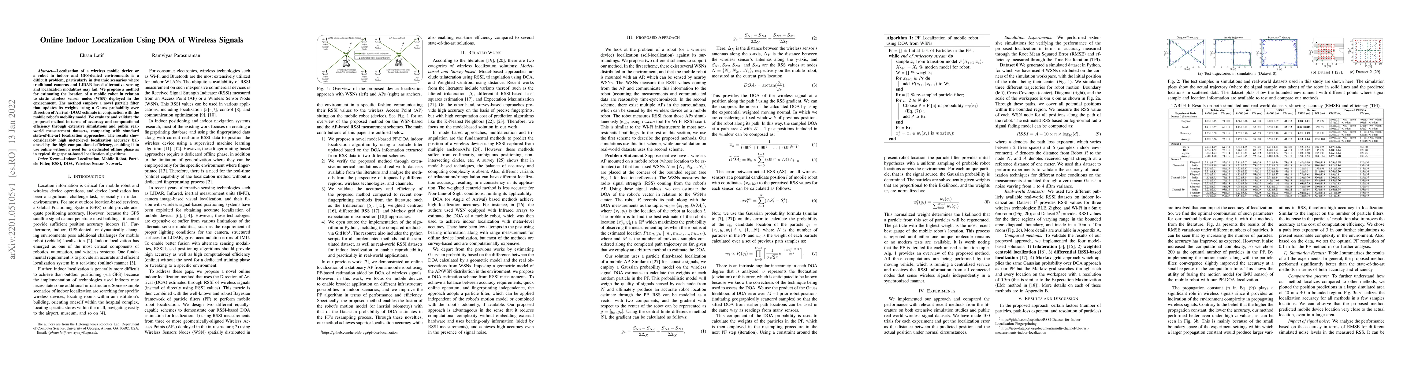 A novel particle filter method estimates a mobile robot's location based on wireless signals' Direction of Arrival (DOA) and mobility model, achieving high meter-level accuracy with low computational efficiency.