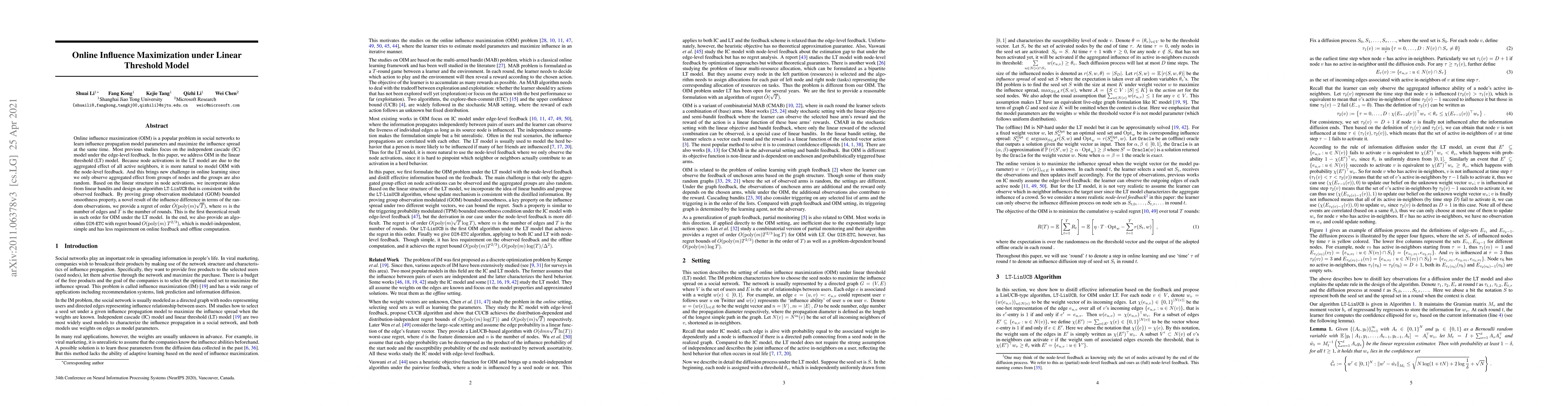 The paper proposes an algorithm, LT-LinUCB, for online influence maximization (OIM) under the linear threshold (LT) model, utilizing node-level feedback. It introduces a group observation modulated (GOM) bounded smoothness property and provides a regret bound of $\tilde{O}(\mathrm{poly}(m)\sqrt{T})$ for LT-LinUCB, and another algorithm, OIM-ETC, with a regret bound of $O(\mathrm{poly}(m)T^{2/3})$ that is model-independent.