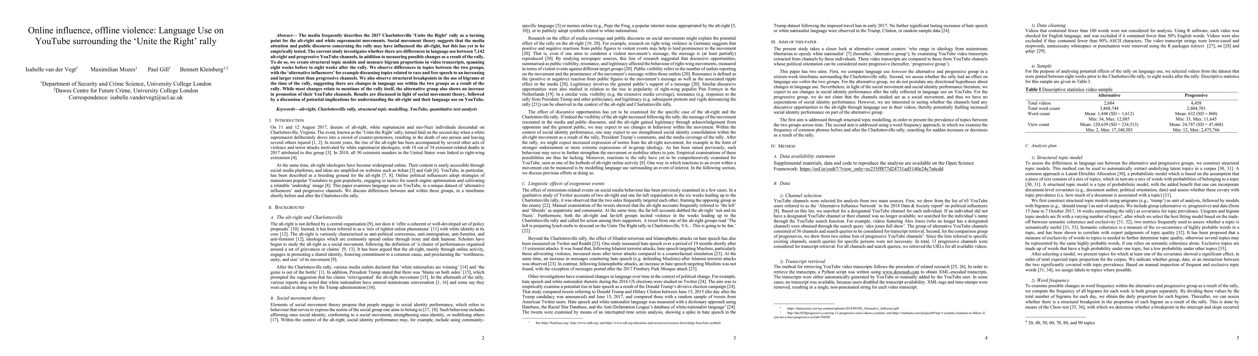 The study examines language use on YouTube channels associated with the alt-right and progressive movements before and after the 2017 Charlottesville 'Unite the Right' rally, finding significant differences in topics and language shifts, particularly an increase in race-related discussions and self-promotion among alt-right channels. Implications for social movement theory and alt-right discourse are discussed.