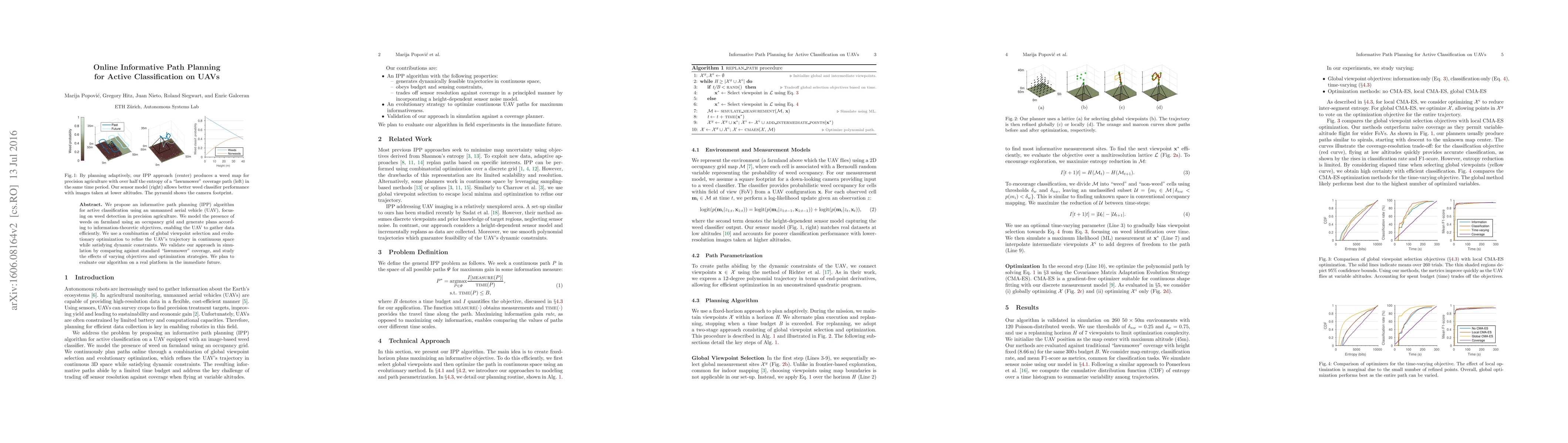 We propose an informative path planning (IPP) algorithm for active classification using an unmanned aerial vehicle (UAV), focusing on weed detection in precision agriculture. We model the presence of weeds on farmland using an occupancy grid and generate plans according to information-theoretic objectives, enabling the UAV to gather data efficiently. We use a combination of global viewpoint selection and evolutionary optimization to refine the UAV's trajectory in continuous space while satisfying dynamic constraints. We validate our approach in simulation by comparing against standard "lawnmower" coverage, and study the effects of varying objectives and optimization strategies. We plan to evaluate our algorithm on a real platform in the immediate future.