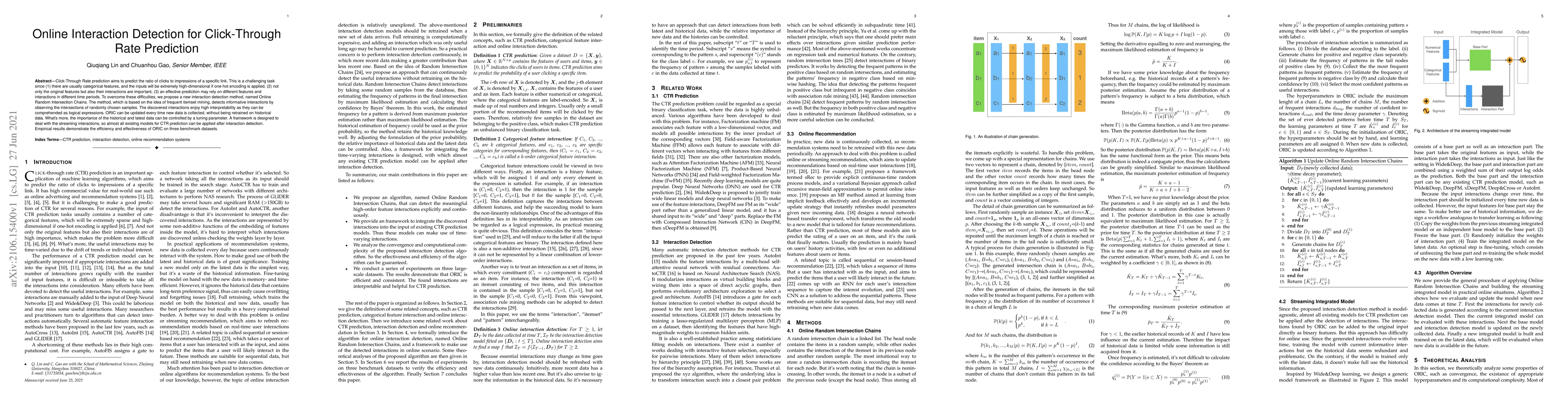 This paper proposes Online Random Intersection Chains (ORIC) to detect interactions for Click-Through Rate prediction, addressing high-dimensional categorical features and temporal variations. ORIC is interpretable, continuously updated, and compatible with existing CTR models, showing effectiveness on benchmark datasets.