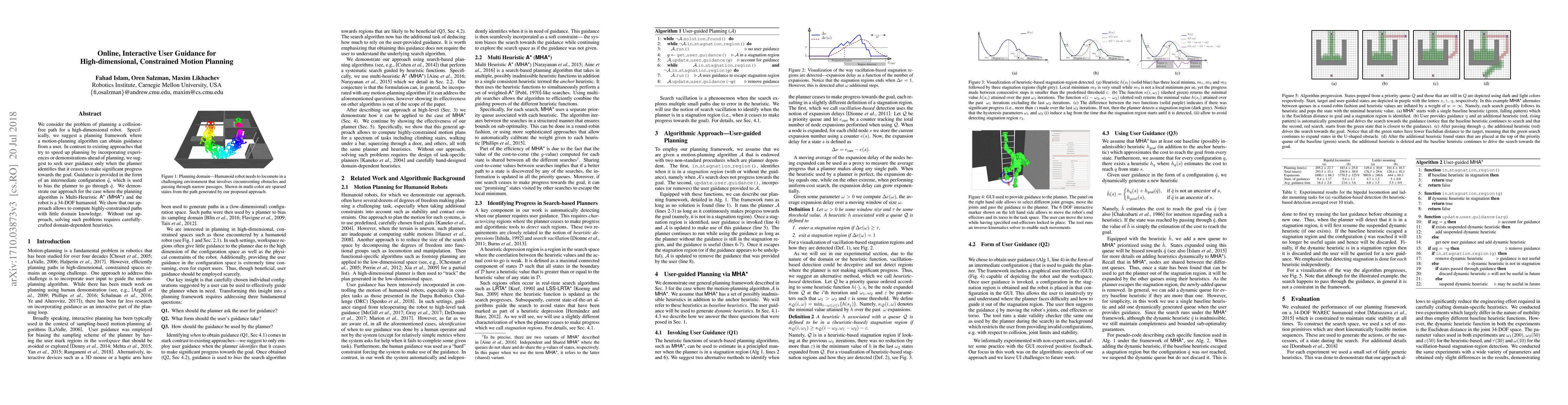 We consider the problem of planning a collision-free path for a high-dimensional robot. Specifically, we suggest a planning framework where a motion-planning algorithm can obtain guidance from a user. In contrast to existing approaches that try to speed up planning by incorporating experiences or demonstrations ahead of planning, we suggest to seek user guidance only when the planner identifies that it ceases to make significant progress towards the goal. Guidance is provided in the form of an intermediate configuration $\hat{q}$, which is used to bias the planner to go through $\hat{q}$. We demonstrate our approach for the case where the planning algorithm is Multi-Heuristic A* (MHA*) and the robot is a 34-DOF humanoid. We show that our approach allows to compute highly-constrained paths with little domain knowledge. Without our approach, solving such problems requires carefully-crafting domain-dependent heuristics.