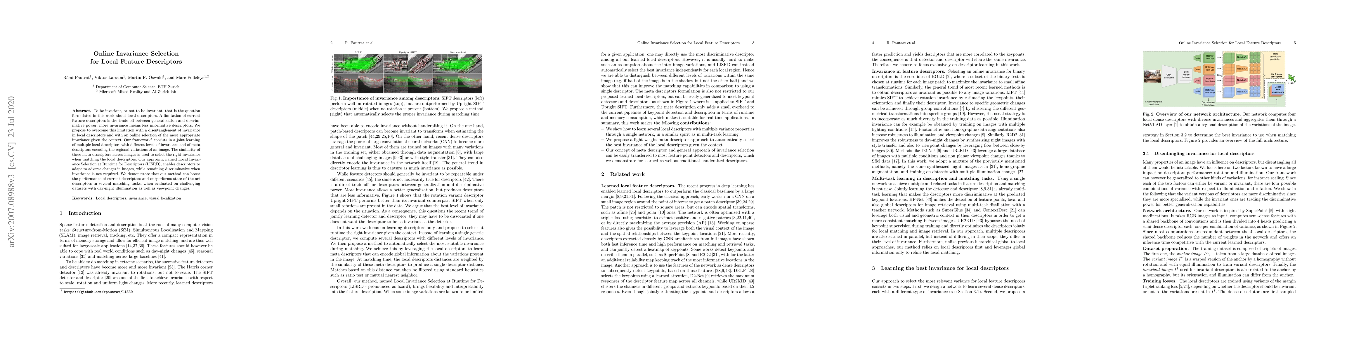 This paper proposes a method called Local Invariance Selection at Runtime for Descriptors (LISRD) to adaptively select the appropriate invariance levels of local feature descriptors for image matching tasks. The framework learns multiple descriptors with varying invariance levels and uses meta descriptors to select the best descriptor based on regional image variations, improving performance over state-of-the-art methods in challenging conditions.