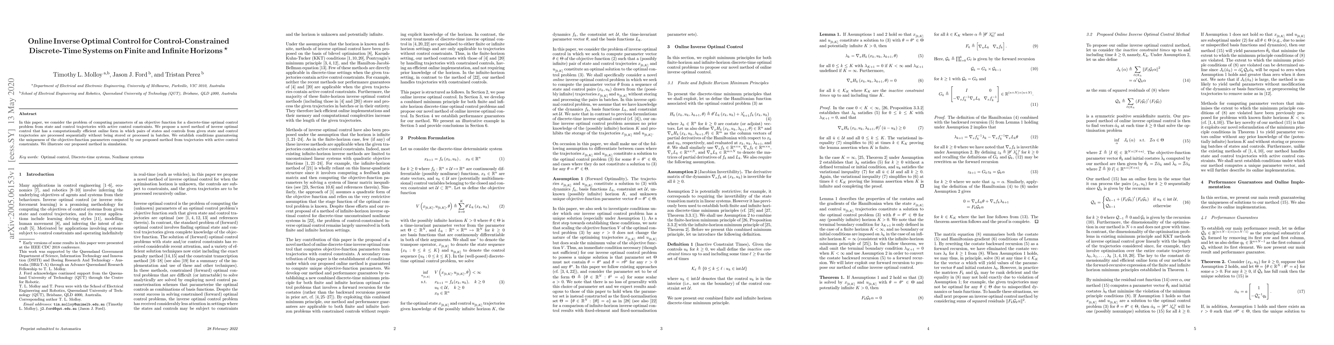 In this paper, we consider the problem of computing parameters of an objective function for a discrete-time optimal control problem from state and control trajectories with active control constraints. We propose a novel method of inverse optimal control that has a computationally efficient online form in which pairs of states and controls from given state and control trajectories are processed sequentially without being stored or processed in batches. We establish conditions guaranteeing the uniqueness of the objective-function parameters computed by our proposed method from trajectories with active control constraints. We illustrate our proposed method in simulation.