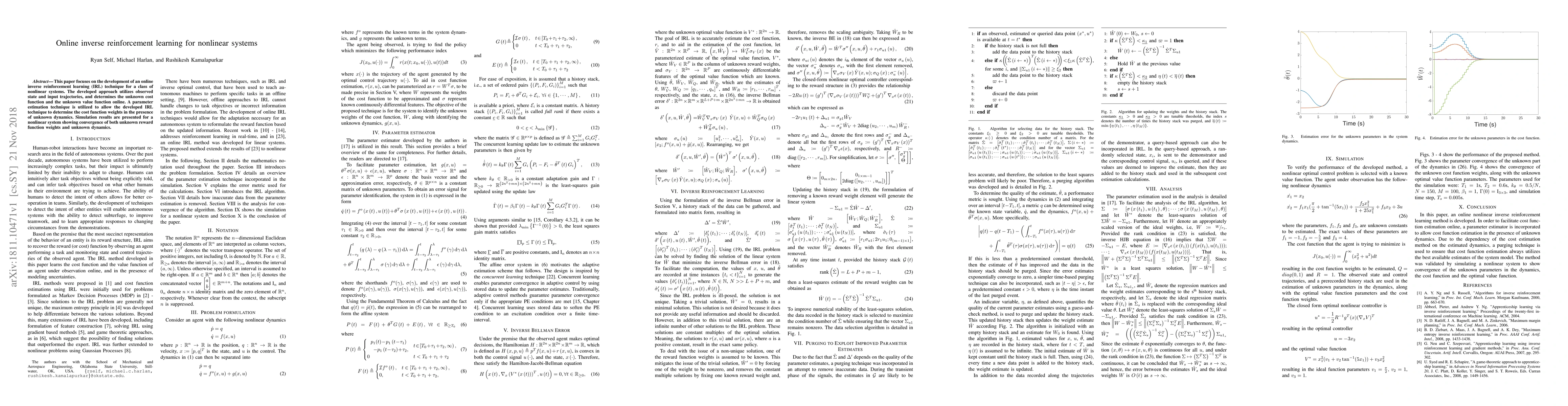 This paper presents an online inverse reinforcement learning technique for nonlinear systems, utilizing observed trajectories to determine unknown cost and value functions. Simulation results demonstrate convergence of both reward function weights and system dynamics.