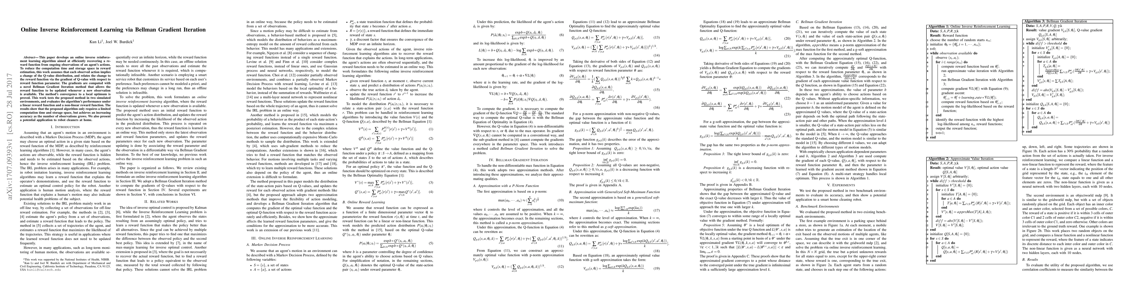This paper develops an online inverse reinforcement learning algorithm aimed at efficiently recovering a reward function from ongoing observations of an agent's actions. To reduce the computation time and storage space in reward estimation, this work assumes that each observed action implies a change of the Q-value distribution, and relates the change to the reward function via the gradient of Q-value with respect to reward function parameter. The gradients are computed with a novel Bellman Gradient Iteration method that allows the reward function to be updated whenever a new observation is available. The method's convergence to a local optimum is proved. This work tests the proposed method in two simulated environments, and evaluates the algorithm's performance under a linear reward function and a non-linear reward function. The results show that the proposed algorithm only requires a limited computation time and storage space, but achieves an increasing accuracy as the number of observations grows. We also present a potential application to robot cleaners at home.