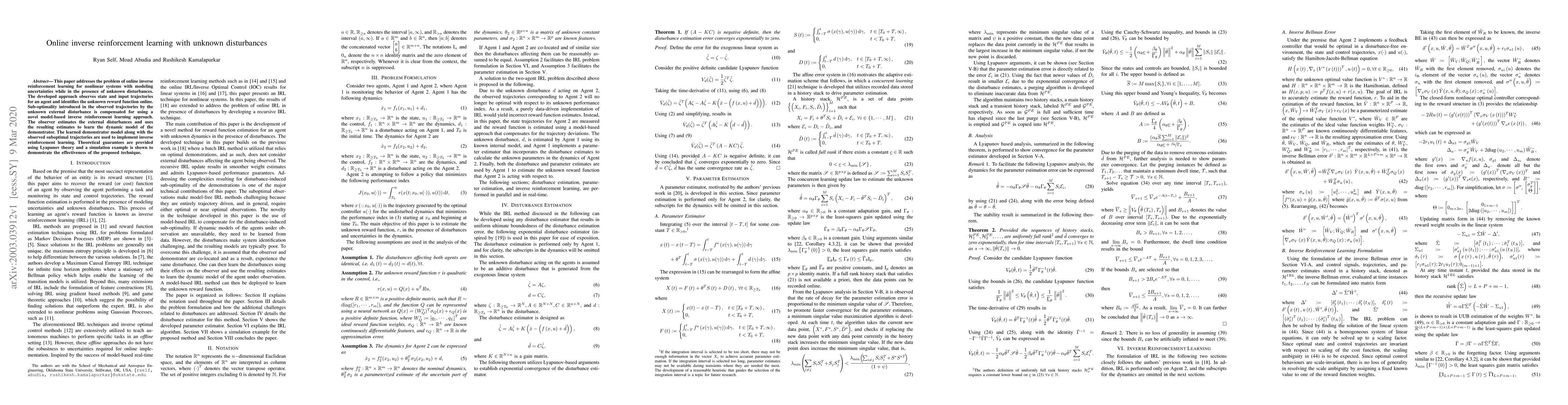 This paper proposes an online inverse reinforcement learning method for nonlinear systems with modeling uncertainties and unknown disturbances, using a model-based approach to estimate disturbances and learn the demonstrator's dynamic model, with theoretical guarantees provided by Lyapunov theory. Simulation results demonstrate the effectiveness of the proposed technique.