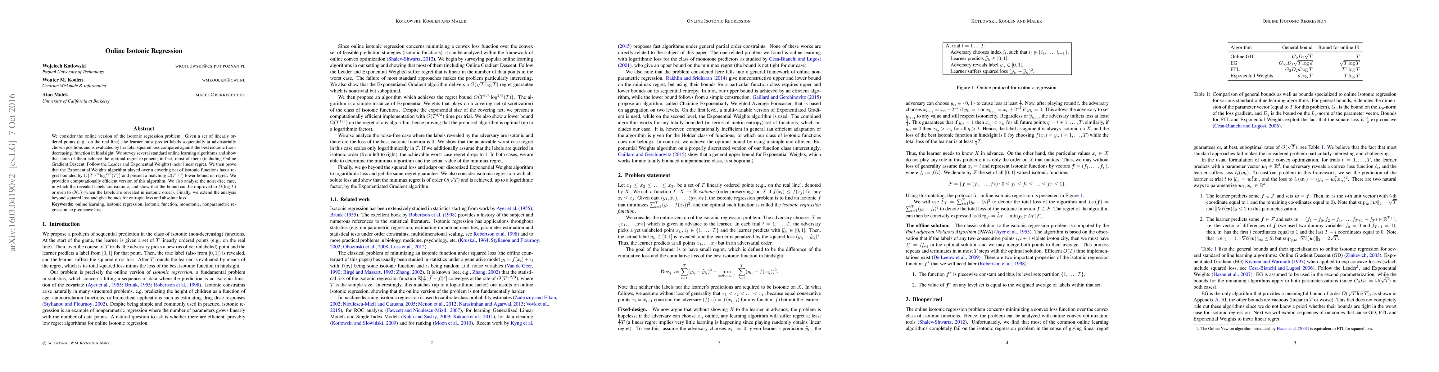 This paper surveys online learning algorithms for isotonic regression, demonstrating that none achieve optimal regret. It proves that the Exponential Weights algorithm over a covering net of isotonic functions achieves a regret bound of $O\big(T^{1/3} \log^{2/3}(T)\big)$, with a matching lower bound, and improves this in noise-free scenarios.