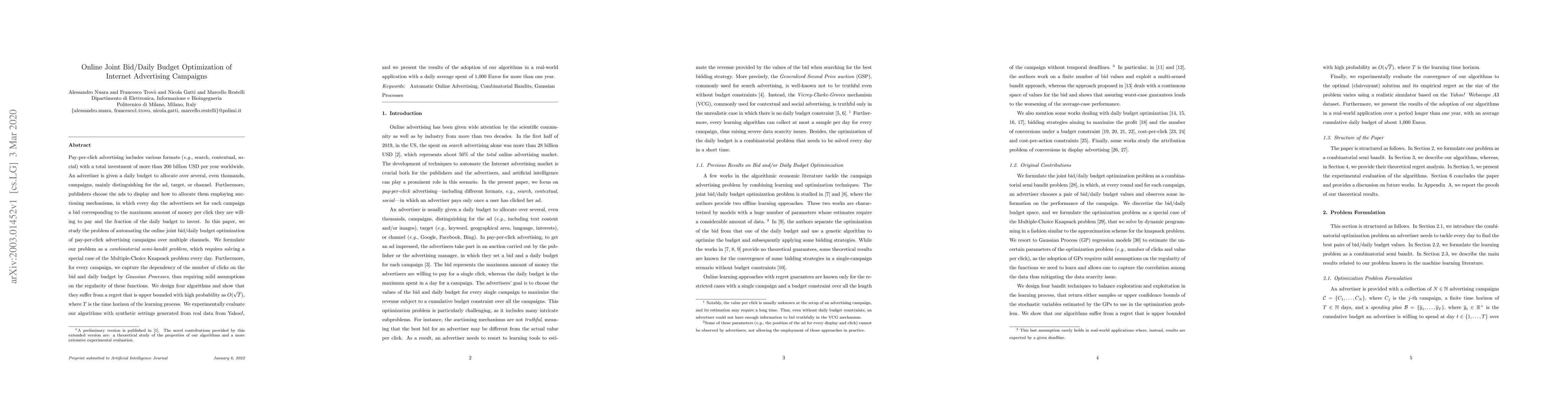 This paper addresses the optimization of online pay-per-click advertising campaigns by automating the joint bid/daily budget allocation across multiple channels. It formulates the problem as a combinatorial semi-bandit issue and employs Gaussian Processes to model click dependencies, designing four algorithms with O(sqrt{T}) regret bounds, validated through synthetic and real-world data from Yahoo!.