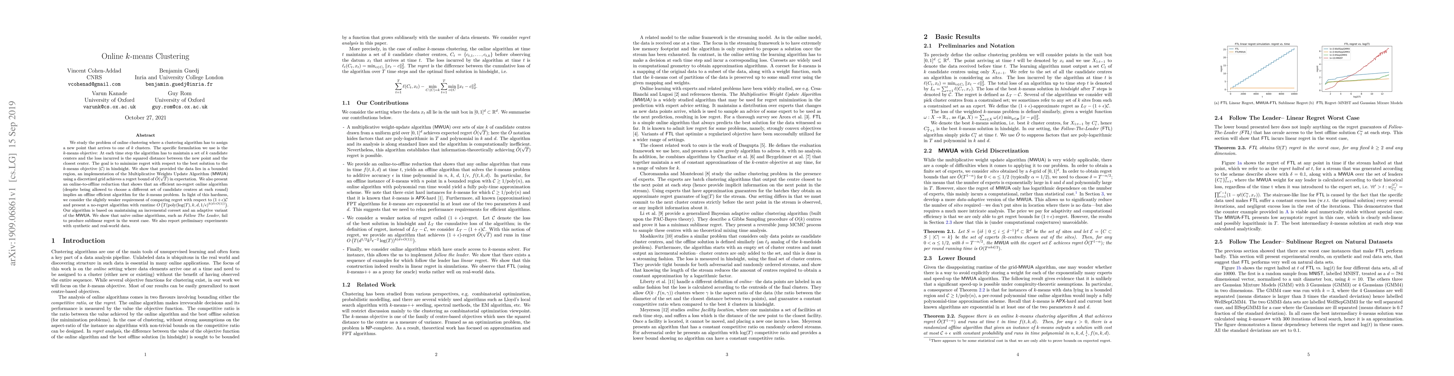 This paper investigates online clustering using the $k$-means objective, focusing on minimizing regret with respect to the best $k$-means solution. It presents an MWUA-based algorithm achieving $\tilde{O}(\sqrt{T})$ regret bound under bounded data, and demonstrates that an efficient no-regret online algorithm implies an offline efficient $k$-means algorithm. The study also introduces a no-regret algorithm with runtime $O\left(T(\mathrm{poly}(log(T),k,d,1/\epsilon)^{k(d+O(1)})\right)$ based on an incremental coreset and adaptive MWUA, and reports preliminary experimental results.