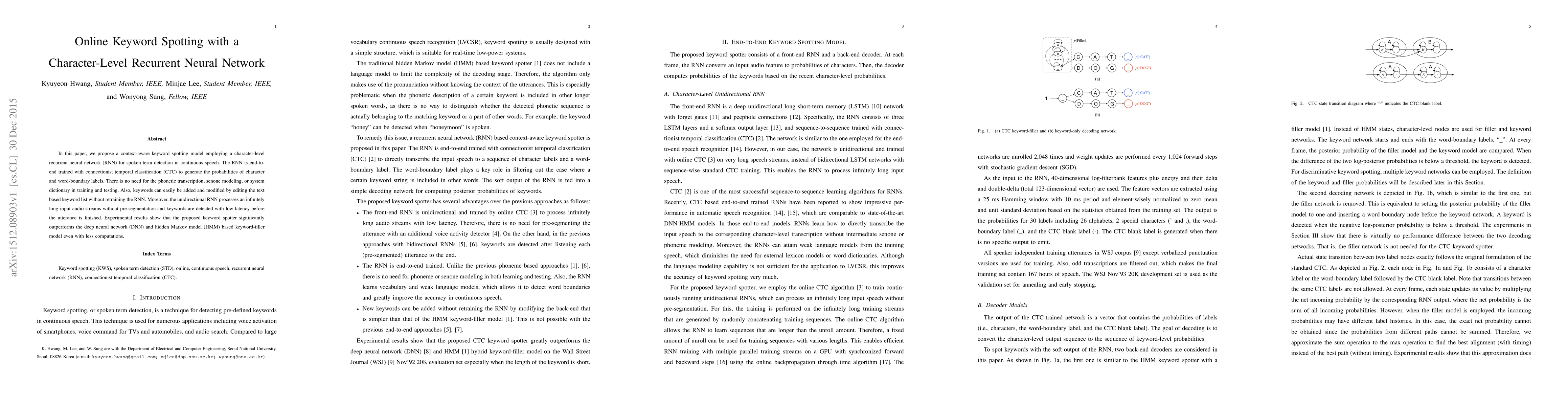 This paper introduces a character-level recurrent neural network (RNN) for online keyword spotting in continuous speech, trained with connectionist temporal classification (CTC) without phonetic transcription. The model achieves high performance and low-latency, outperforming DNN and HMM-based models with minimal computational overhead.