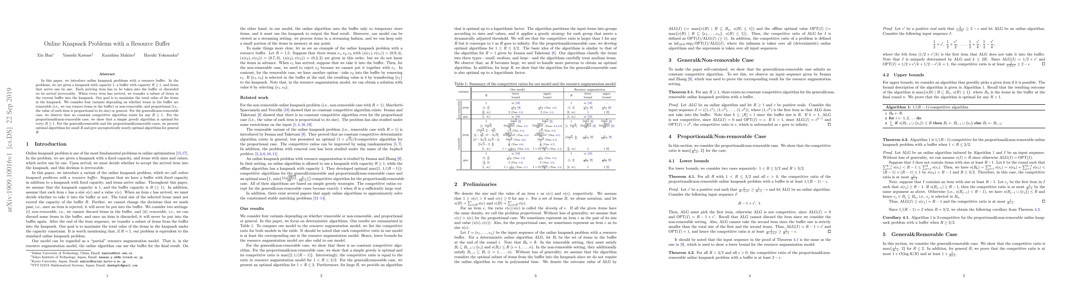 The paper introduces online knapsack problems with a resource buffer, analyzing four variants based on item removability and value proportionality.