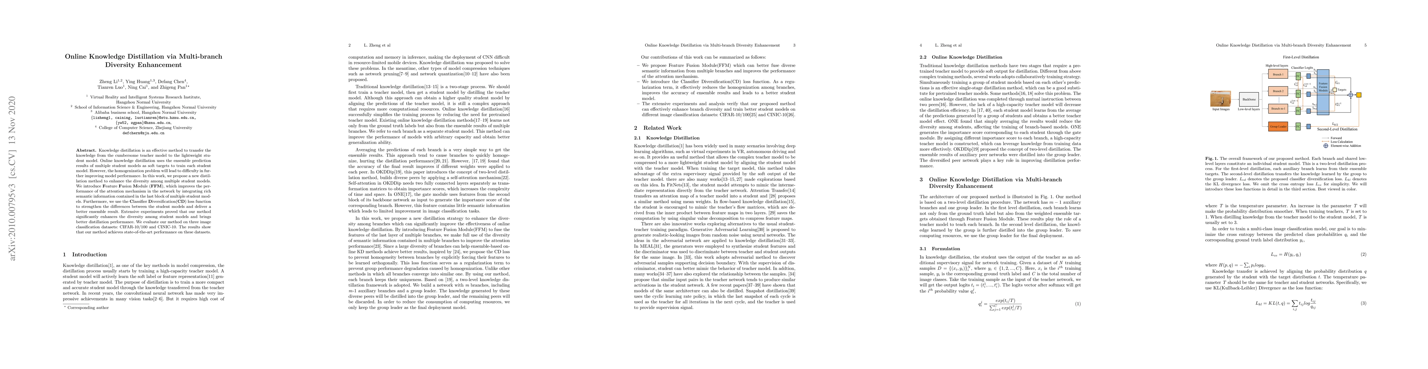 This paper proposes a method for online knowledge distillation that enhances diversity among multiple student models using a Feature Fusion Module and a Classifier Diversification loss function. The approach achieves state-of-the-art performance on CIFAR-10/100 and CINIC-10 datasets by improving the attention mechanism and reducing homogenization.