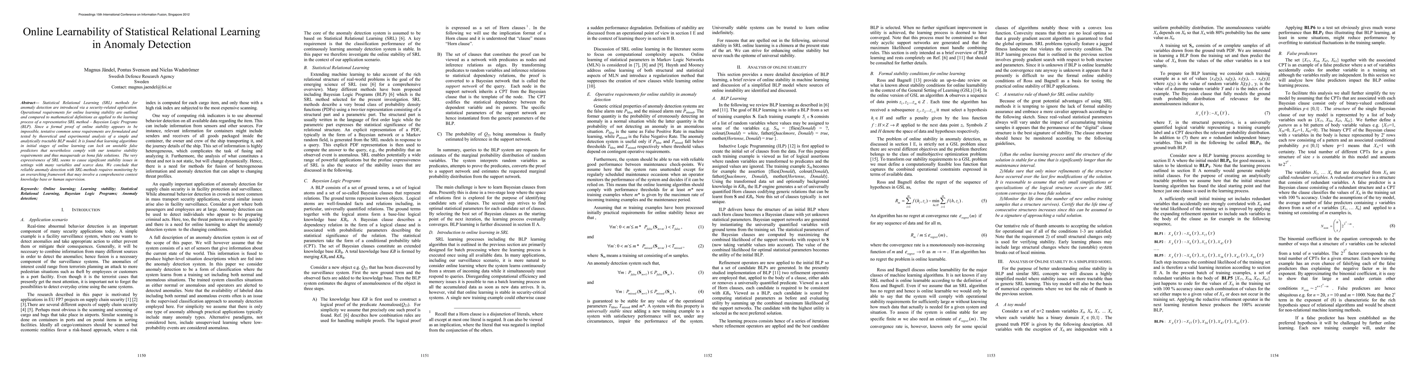 This paper investigates the online learnability of Statistical Relational Learning (SRL) methods, particularly Bayesian Logic Programs (BLP), for anomaly detection in security applications. It finds that while SRL's expressiveness aids in modeling complex relationships, it introduces significant stability issues, necessitating an overarching framework for reliable detection.