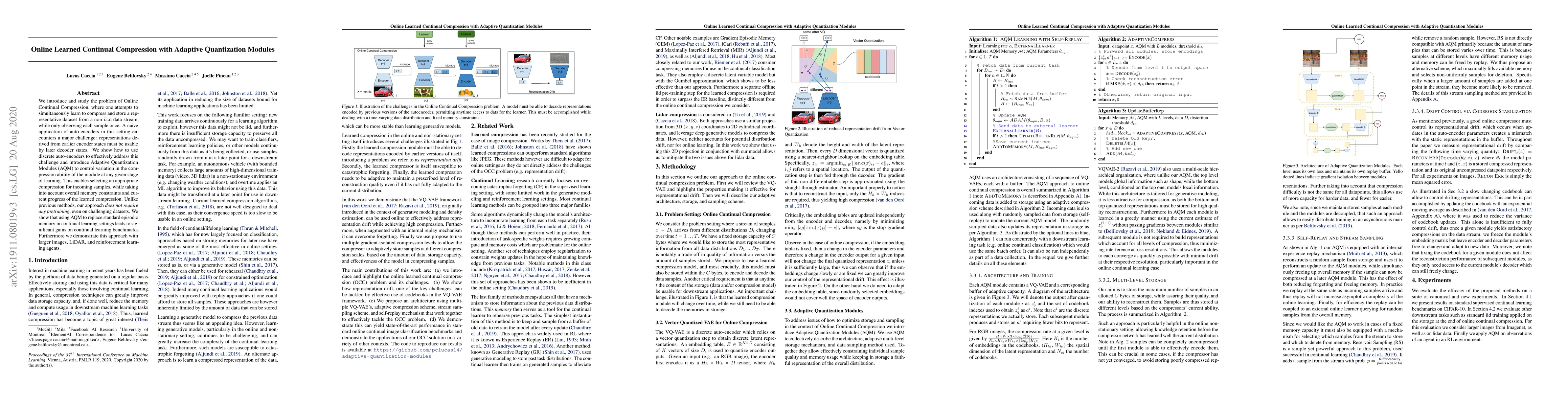 We introduce and study the problem of Online Continual Compression, where one attempts to simultaneously learn to compress and store a representative dataset from a non i.i.d data stream, while only observing each sample once. A naive application of auto-encoders in this setting encounters a major challenge: representations derived from earlier encoder states must be usable by later decoder states. We show how to use discrete auto-encoders to effectively address this challenge and introduce Adaptive Quantization Modules (AQM) to control variation in the compression ability of the module at any given stage of learning. This enables selecting an appropriate compression for incoming samples, while taking into account overall memory constraints and current progress of the learned compression. Unlike previous methods, our approach does not require any pretraining, even on challenging datasets. We show that using AQM to replace standard episodic memory in continual learning settings leads to significant gains on continual learning benchmarks. Furthermore we demonstrate this approach with larger images, LiDAR, and reinforcement learning environments.