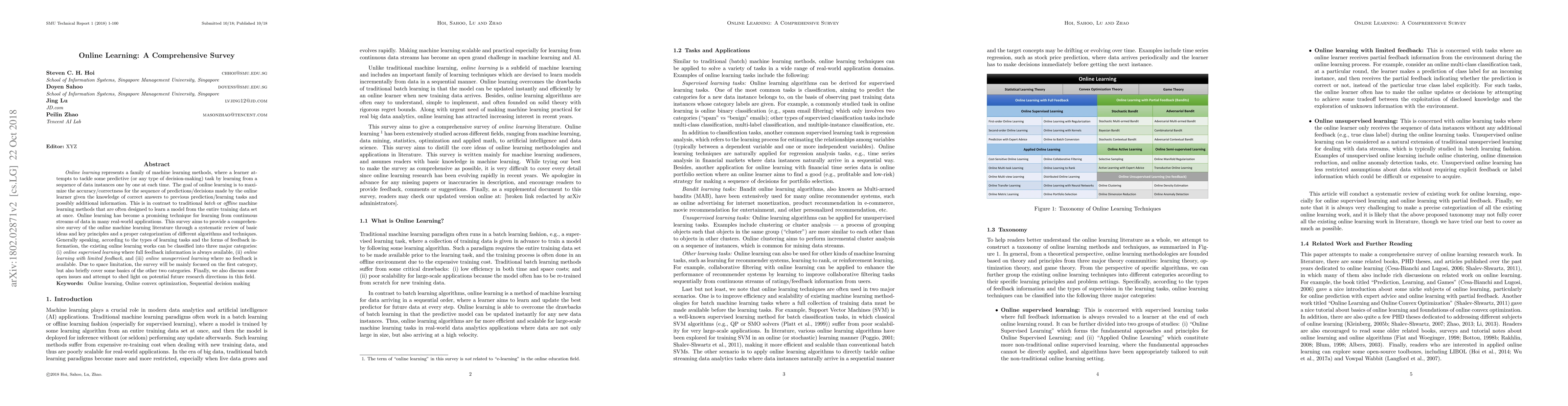 Online learning represents an important family of machine learning algorithms, in which a learner attempts to resolve an online prediction (or any type of decision-making) task by learning a model/hypothesis from a sequence of data instances one at a time. The goal of online learning is to ensure that the online learner would make a sequence of accurate predictions (or correct decisions) given the knowledge of correct answers to previous prediction or learning tasks and possibly additional information. This is in contrast to many traditional batch learning or offline machine learning algorithms that are often designed to train a model in batch from a given collection of training data instances. This survey aims to provide a comprehensive survey of the online machine learning literatures through a systematic review of basic ideas and key principles and a proper categorization of different algorithms and techniques. Generally speaking, according to the learning type and the forms of feedback information, the existing online learning works can be classified into three major categories: (i) supervised online learning where full feedback information is always available, (ii) online learning with limited feedback, and (iii) unsupervised online learning where there is no feedback available. Due to space limitation, the survey will be mainly focused on the first category, but also briefly cover some basics of the other two categories. Finally, we also discuss some open issues and attempt to shed light on potential future research directions in this field.