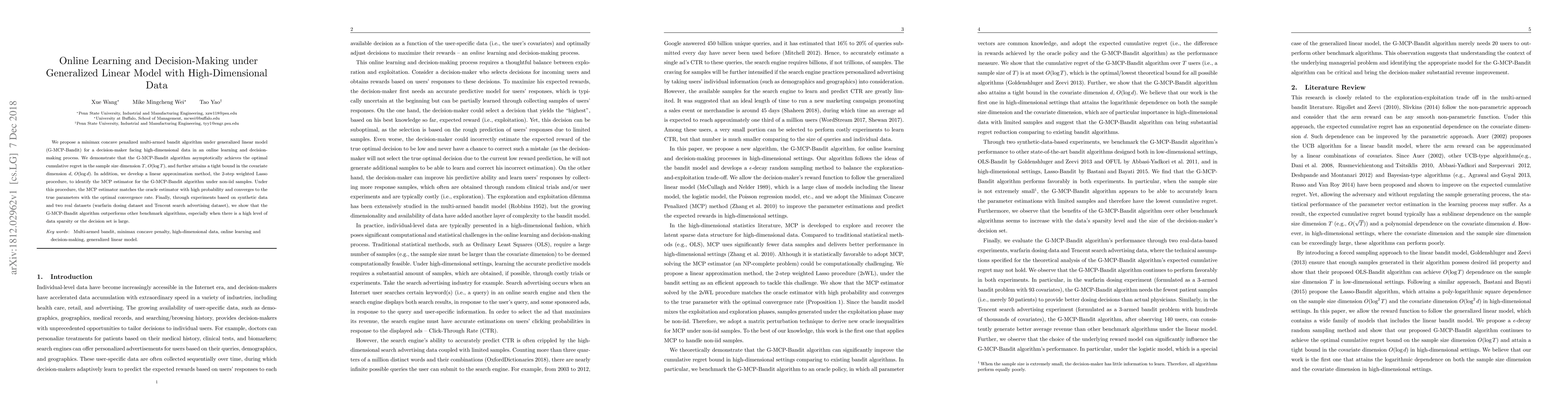 This paper introduces a G-MCP-Bandit algorithm for online learning and decision-making with high-dimensional data, achieving optimal cumulative regret. It also presents a 2-step weighted Lasso procedure for identifying the MCP estimator, demonstrating superior performance over benchmarks in experiments with synthetic and real datasets.