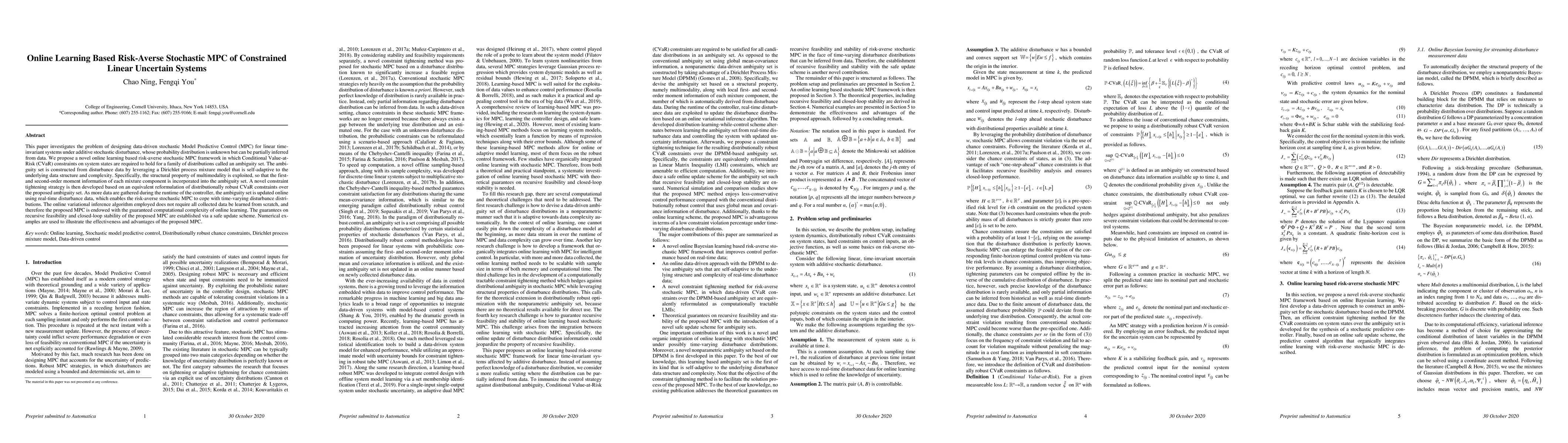 This paper proposes an online learning-based risk-averse stochastic MPC framework for uncertain linear systems with unknown disturbance distributions. It utilizes a Dirichlet process mixture model to construct an adaptive ambiguity set, incorporating first- and second-order moment information, and employs a constraint tightening strategy to ensure feasibility and stability.