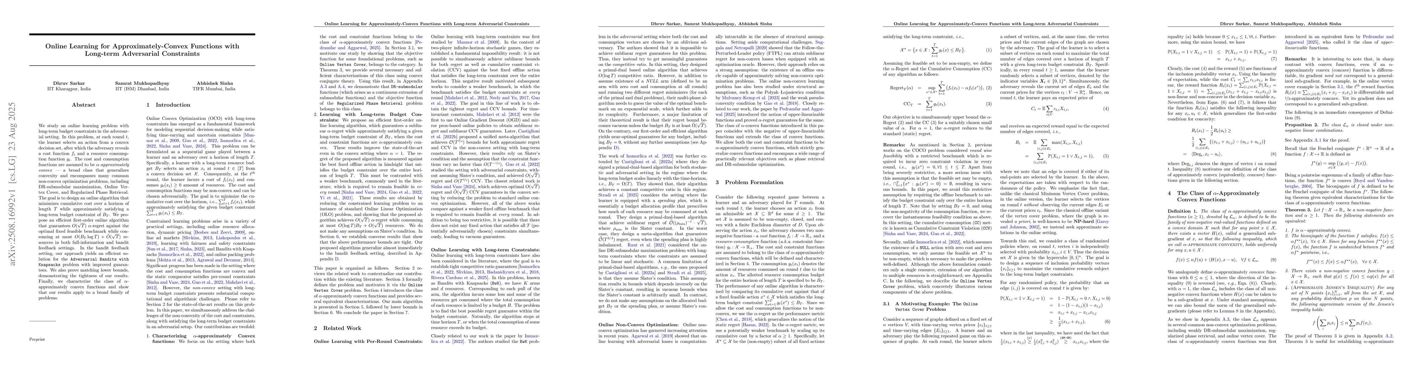 We study an online learning problem with long-term budget constraints in the adversarial setting. In this problem, at each round $t$, the learner selects an action from a convex decision set, after which the adversary reveals a cost function $f_t$ and a resource consumption function $g_t$. The cost and consumption functions are assumed to be $\alpha$-approximately convex - a broad class that generalizes convexity and encompasses many common non-convex optimization problems, including DR-submodular maximization, Online Vertex Cover, and Regularized Phase Retrieval. The goal is to design an online algorithm that minimizes cumulative cost over a horizon of length $T$ while approximately satisfying a long-term budget constraint of $B_T$. We propose an efficient first-order online algorithm that guarantees $O(\sqrt{T})$ $\alpha$-regret against the optimal fixed feasible benchmark while consuming at most $O(B_T \log T)+ \tilde{O}(\sqrt{T})$ resources in both full-information and bandit feedback settings. In the bandit feedback setting, our approach yields an efficient solution for the $\texttt{Adversarial Bandits with Knapsacks}$ problem with improved guarantees. We also prove matching lower bounds, demonstrating the tightness of our results. Finally, we characterize the class of $\alpha$-approximately convex functions and show that our results apply to a broad family of problems.