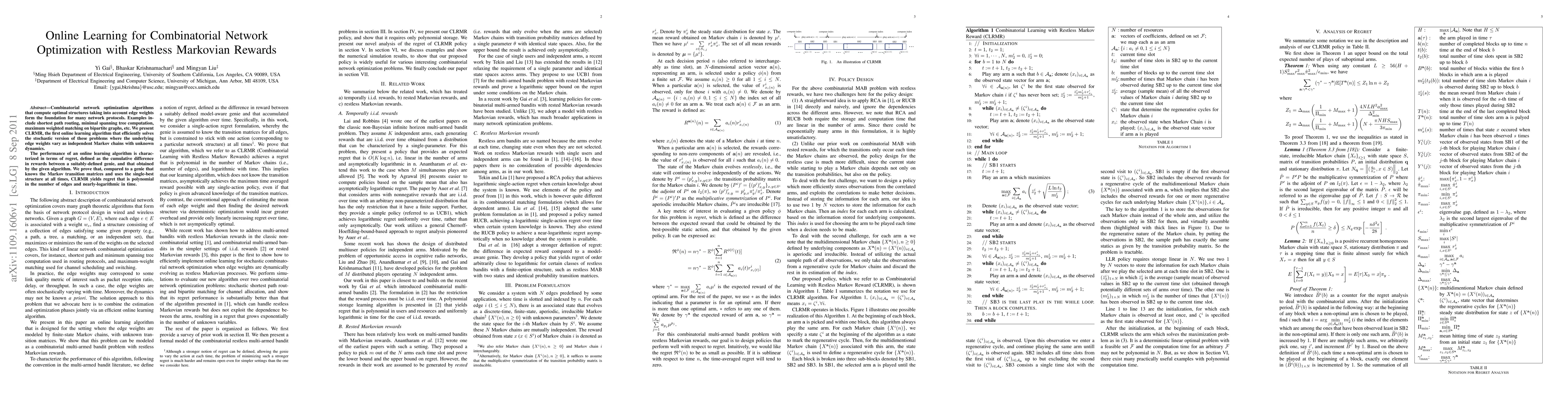 Combinatorial network optimization algorithms that compute optimal structures taking into account edge weights form the foundation for many network protocols. Examples include shortest path routing, minimal spanning tree computation, maximum weighted matching on bipartite graphs, etc. We present CLRMR, the first online learning algorithm that efficiently solves the stochastic version of these problems where the underlying edge weights vary as independent Markov chains with unknown dynamics. The performance of an online learning algorithm is characterized in terms of regret, defined as the cumulative difference in rewards between a suitably-defined genie, and that obtained by the given algorithm. We prove that, compared to a genie that knows the Markov transition matrices and uses the single-best structure at all times, CLRMR yields regret that is polynomial in the number of edges and nearly-logarithmic in time.