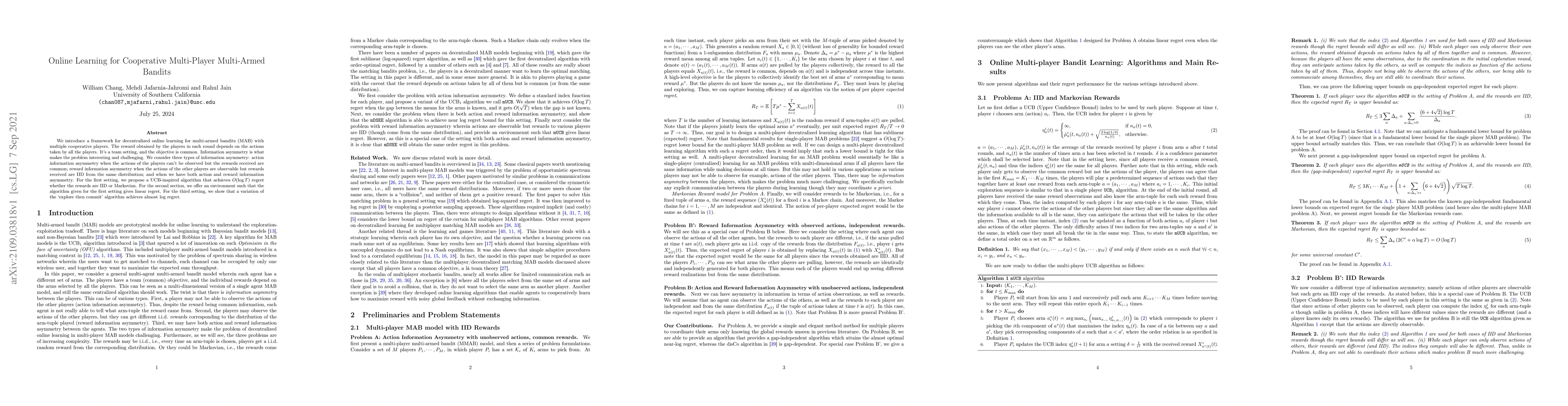 We introduce a framework for decentralized online learning for multi-armed bandits (MAB) with multiple cooperative players. The reward obtained by the players in each round depends on the actions taken by all the players. It's a team setting, and the objective is common. Information asymmetry is what makes the problem interesting and challenging. We consider three types of information asymmetry: action information asymmetry when the actions of the players can't be observed but the rewards received are common; reward information asymmetry when the actions of the other players are observable but rewards received are IID from the same distribution; and when we have both action and reward information asymmetry. For the first setting, we propose a UCB-inspired algorithm that achieves $O(\log T)$ regret whether the rewards are IID or Markovian. For the second section, we offer an environment such that the algorithm given for the first setting gives linear regret. For the third setting, we show that a variation of the `explore then commit' algorithm achieves almost log regret.