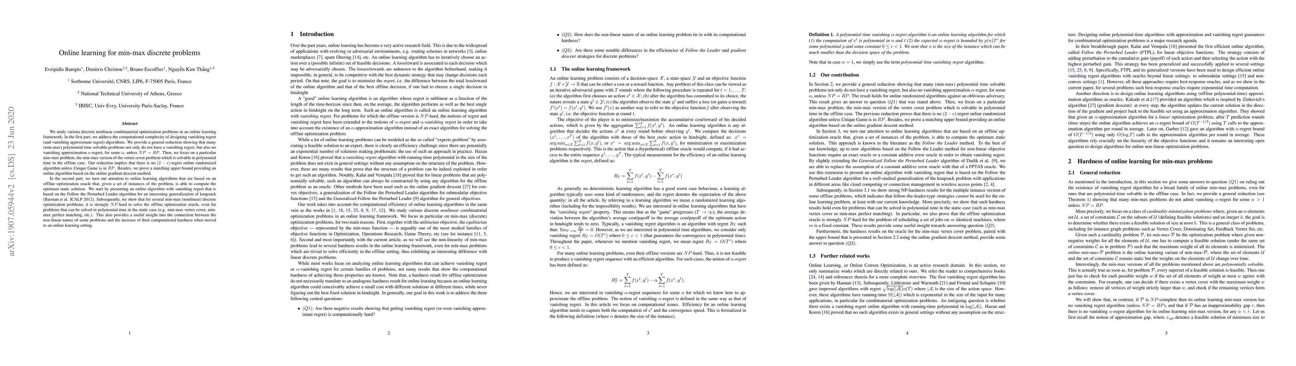We study various discrete nonlinear combinatorial optimization problems in an online learning framework. In the first part, we address the question of whether there are negative results showing that getting a vanishing (or even vanishing approximate) regret is computational hard. We provide a general reduction showing that many (min-max) polynomial time solvable problems not only do not have a vanishing regret, but also no vanishing approximation $\alpha$-regret, for some $\alpha$ (unless $NP=BPP$). Then, we focus on a particular min-max problem, the min-max version of the vertex cover problem which is solvable in polynomial time in the offline case. The previous reduction proves that there is no $(2-\epsilon)$-regret online algorithm, unless Unique Game is in $BPP$; we prove a matching upper bound providing an online algorithm based on the online gradient descent method. Then, we turn our attention to online learning algorithms that are based on an offline optimization oracle that, given a set of instances of the problem, is able to compute the optimum static solution. We show that for different nonlinear discrete optimization problems, it is strongly $NP$-hard to solve the offline optimization oracle, even for problems that can be solved in polynomial time in the static case (e.g. min-max vertex cover, min-max perfect matching, etc.). On the positive side, we present an online algorithm with vanishing regret that is based on the follow the perturbed leader algorithm for a generalized knapsack problem.