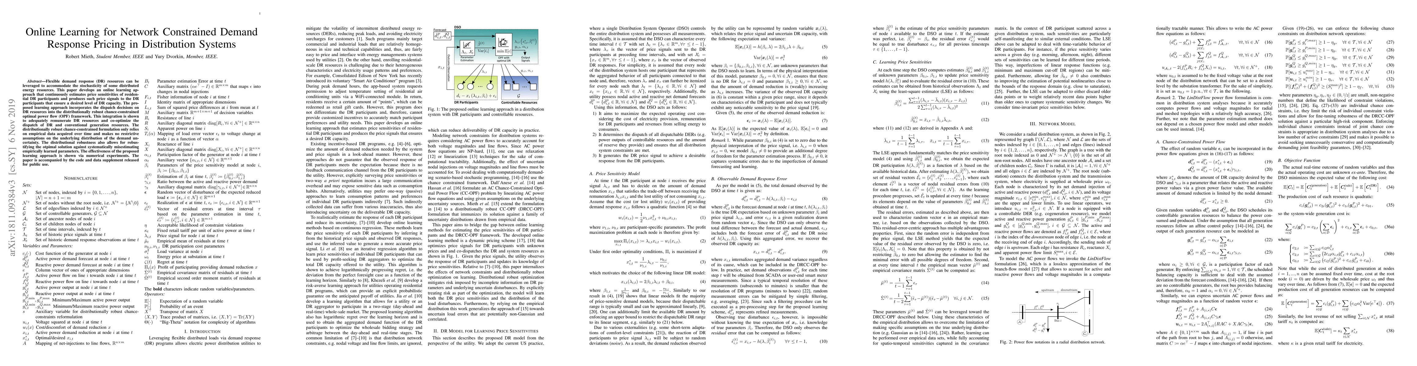 Flexible demand response (DR) resources can be leveraged to accommodate the stochasticity of some distributed energy resources. This paper develops an online learning approach that continuously estimates price sensitivities of residential DR participants and produces such price signals to the DR participants that ensure a desired level of DR capacity. The proposed learning approach incorporates the dispatch decisions on DR resources into the distributionally robust chance-constrained optimal power flow (OPF) framework. This integration is shown to adequately remunerate DR resources and co-optimize the dispatch of DR and conventional generation resources. The distributionally robust chance-constrained formulation only relies on empirical data acquired over time and makes no restrictive assumptions on the underlying distribution of the demand uncertainty. The distributional robustness also allows for robustifying the optimal solution against systematically misestimating empirically learned parameters. The effectiveness of the proposed learning approach is shown via numerical experiments. The paper is accompanied by the code and data supplement released for public use, see [27].