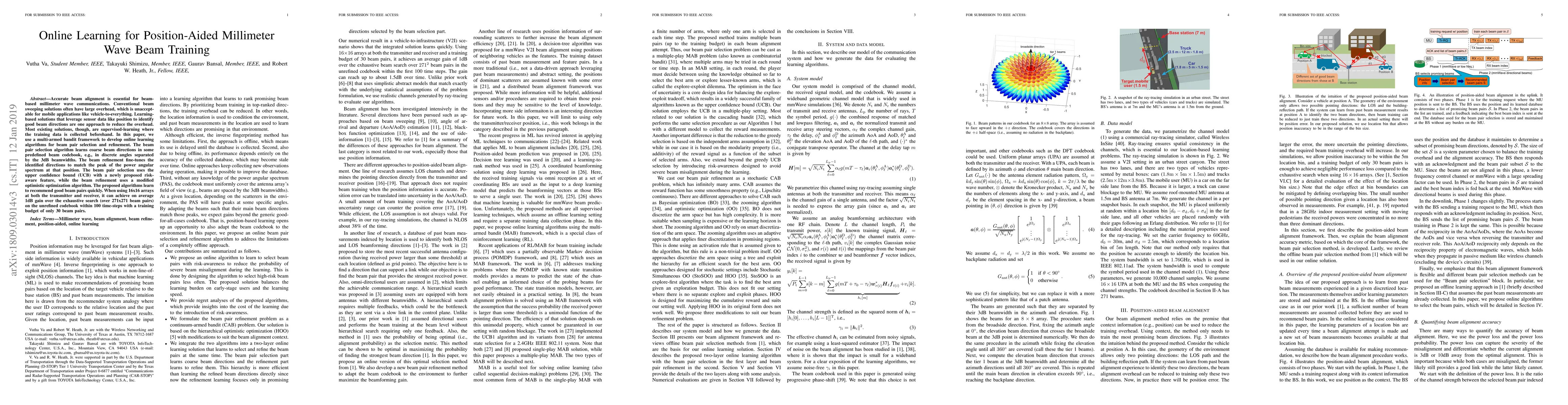 Researchers developed online learning algorithms for beam alignment in millimeter wave communications, achieving a 1dB gain over exhaustive search within 100 time-steps with limited training data.