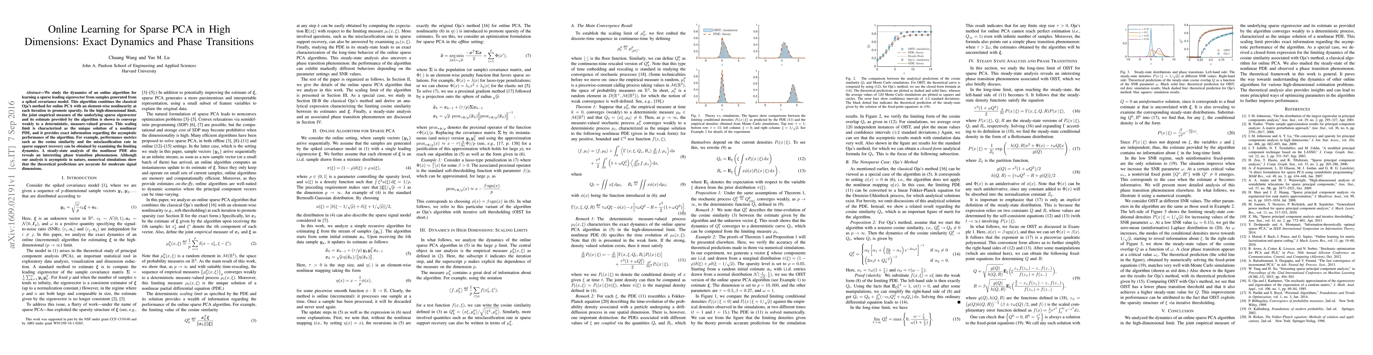 This paper investigates the dynamics of an online algorithm for sparse PCA in high dimensions, demonstrating its convergence to a deterministic process described by a nonlinear PDE. The analysis reveals phase transition phenomena and provides exact asymptotic performance metrics, validated by numerical simulations.