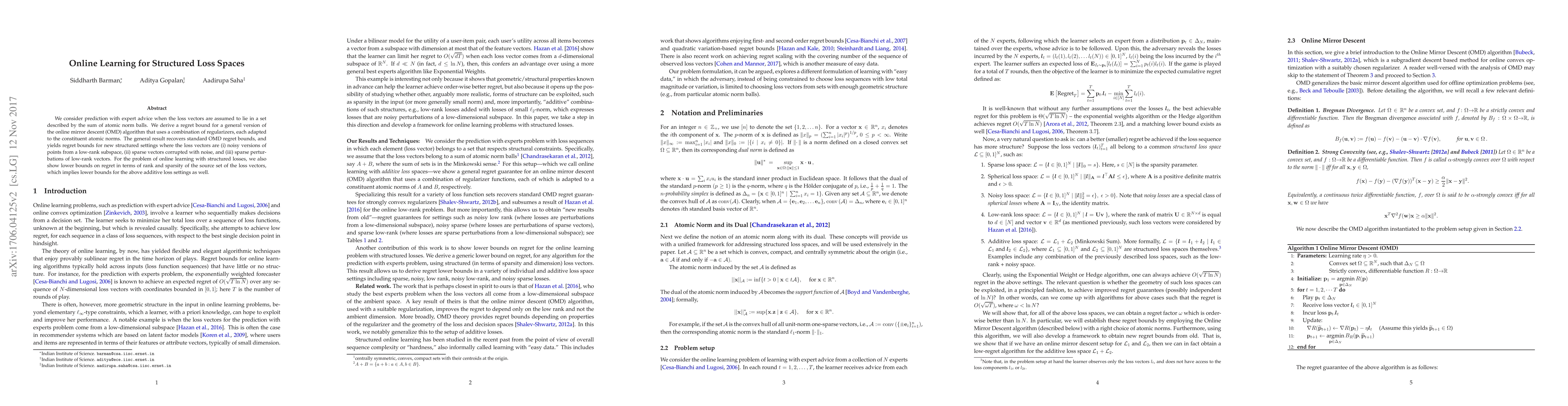 This paper develops a regret bound for an online mirror descent algorithm tailored to structured loss spaces, including low-rank, sparse, and perturbed vectors. It also establishes lower bounds on regret based on the rank and sparsity of the loss vectors, providing insights into the algorithm's performance in various structured settings.