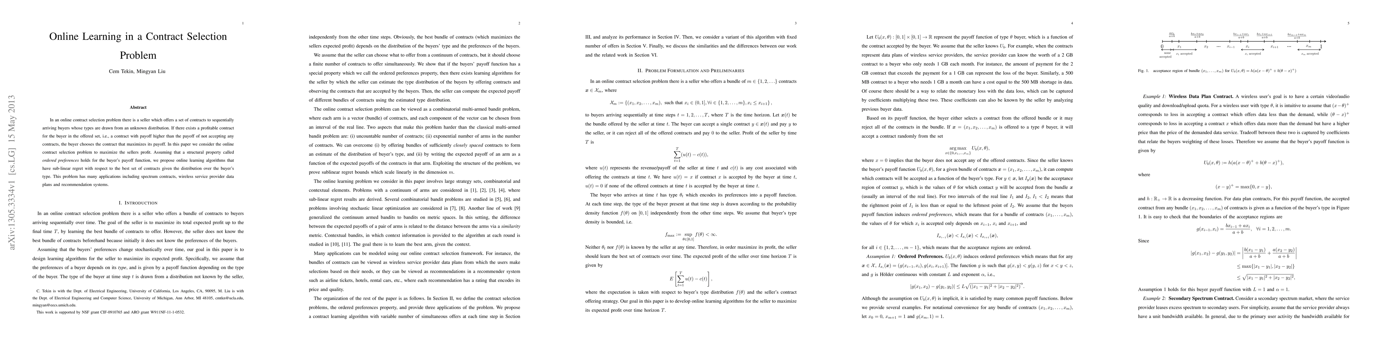 This paper explores online contract selection to maximize seller profit in a dynamic environment where buyers sequentially choose from a set of contracts. It proposes learning algorithms that achieve sub-linear regret, leveraging the assumption of ordered preferences in buyer payoffs, with applications in spectrum contracts, data plans, and recommendation systems.