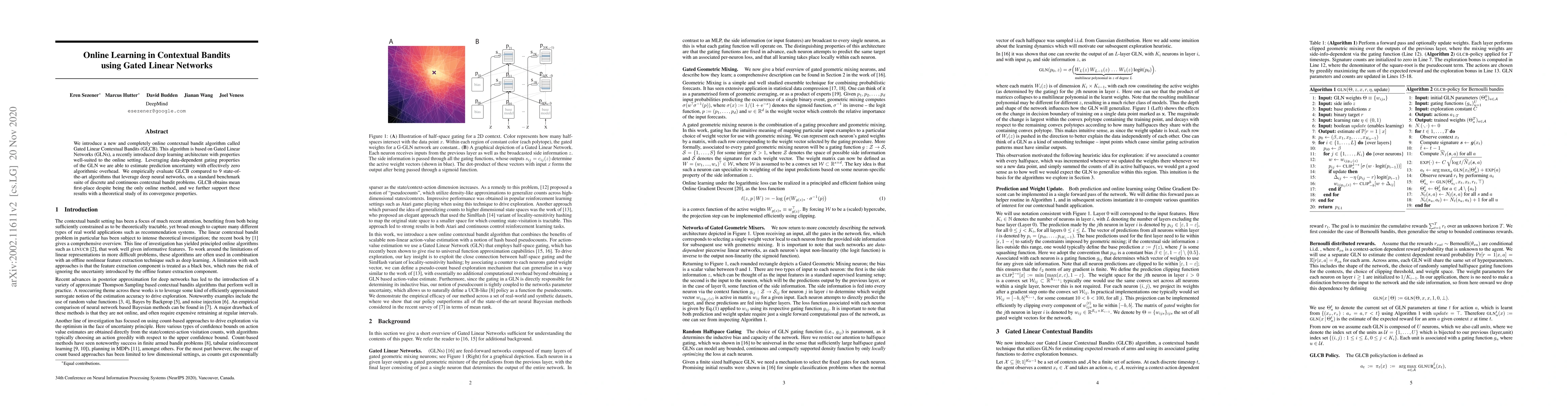 We introduce a new and completely online contextual bandit algorithm called Gated Linear Contextual Bandits (GLCB). This algorithm is based on Gated Linear Networks (GLNs), a recently introduced deep learning architecture with properties well-suited to the online setting. Leveraging data-dependent gating properties of the GLN we are able to estimate prediction uncertainty with effectively zero algorithmic overhead. We empirically evaluate GLCB compared to 9 state-of-the-art algorithms that leverage deep neural networks, on a standard benchmark suite of discrete and continuous contextual bandit problems. GLCB obtains median first-place despite being the only online method, and we further support these results with a theoretical study of its convergence properties.