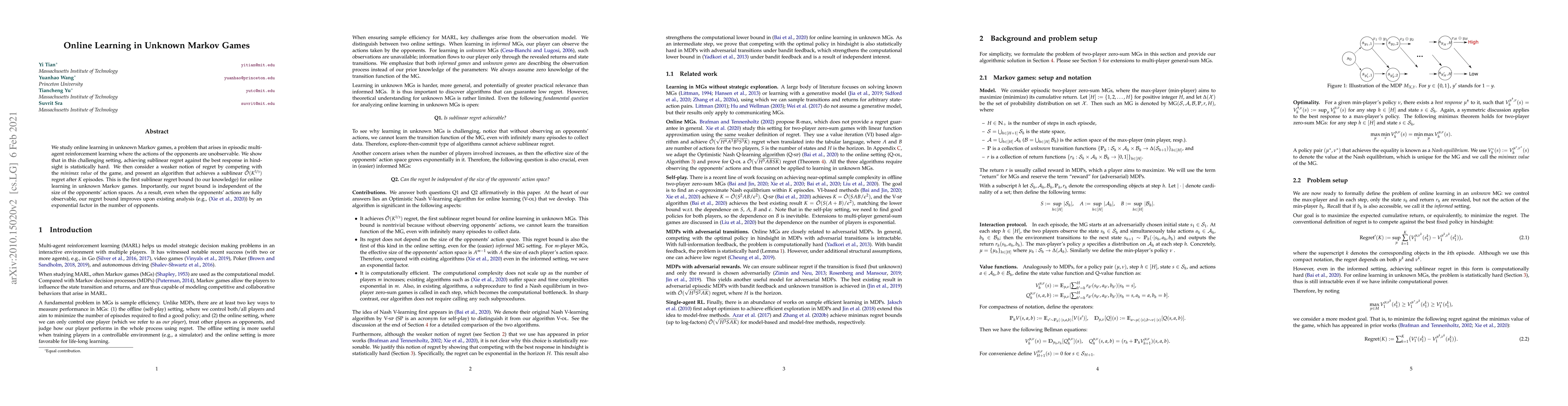 We study online learning in unknown Markov games, a problem that arises in episodic multi-agent reinforcement learning where the actions of the opponents are unobservable. We show that in this challenging setting, achieving sublinear regret against the best response in hindsight is statistically hard. We then consider a weaker notion of regret by competing with the \emph{minimax value} of the game, and present an algorithm that achieves a sublinear $\tilde{\mathcal{O}}(K^{2/3})$ regret after $K$ episodes. This is the first sublinear regret bound (to our knowledge) for online learning in unknown Markov games. Importantly, our regret bound is independent of the size of the opponents' action spaces. As a result, even when the opponents' actions are fully observable, our regret bound improves upon existing analysis (e.g., (Xie et al., 2020)) by an exponential factor in the number of opponents.