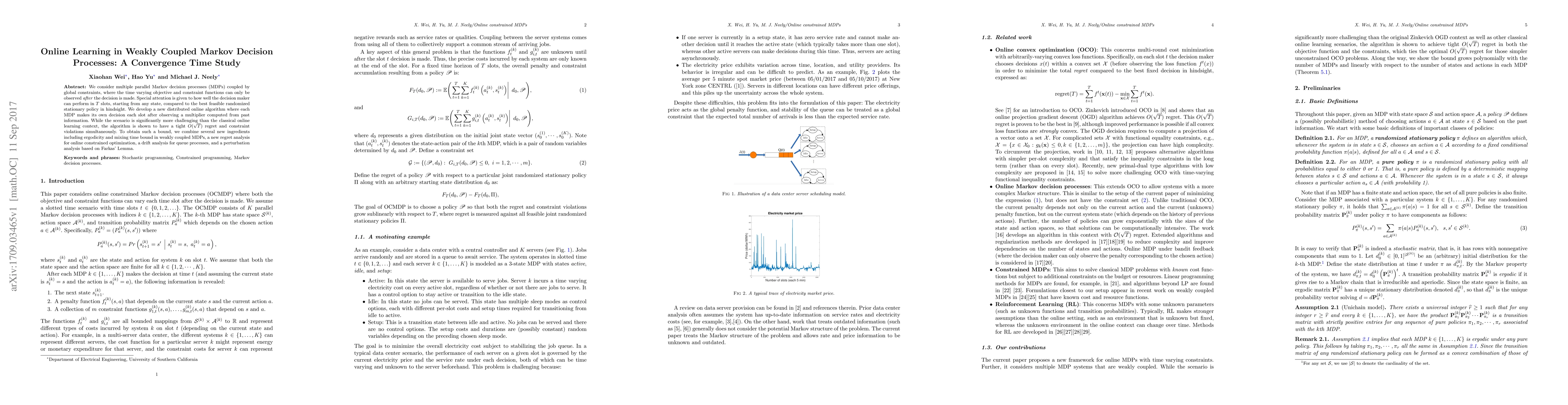 This paper studies online learning in weakly coupled Markov decision processes with global constraints, developing a distributed algorithm that achieves $O(\sqrt{T})$ regret and constraint violations. The algorithm leverages ergodicity, mixing time bounds, and advanced regret analysis techniques to handle the complexity of the scenario.