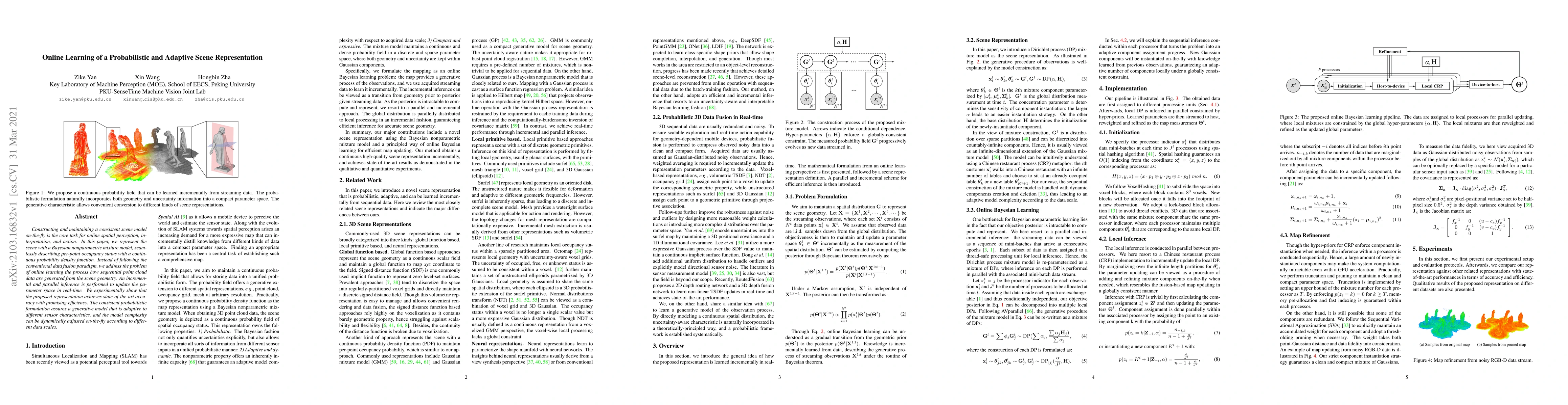 This paper proposes a Bayesian nonparametric mixture model for online learning of a probabilistic and adaptive scene representation. The model updates in real-time using incremental and parallel inference, achieving state-of-the-art accuracy and efficiency while dynamically adjusting complexity based on data scale.