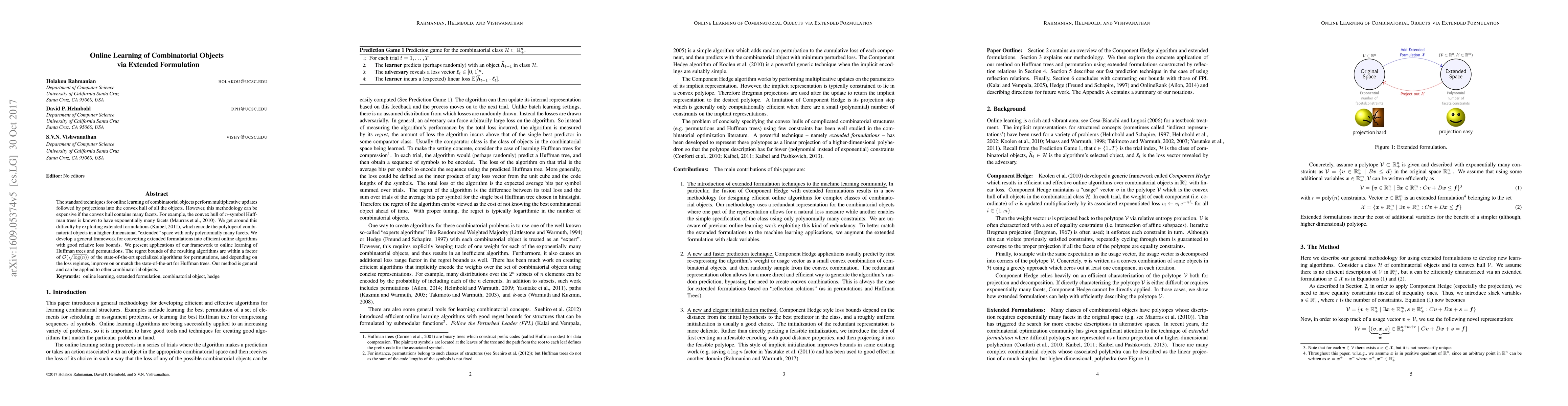 Researchers develop a framework for converting extended formulations into efficient online algorithms for learning combinatorial objects, improving regret bounds for Huffman trees and permutations.