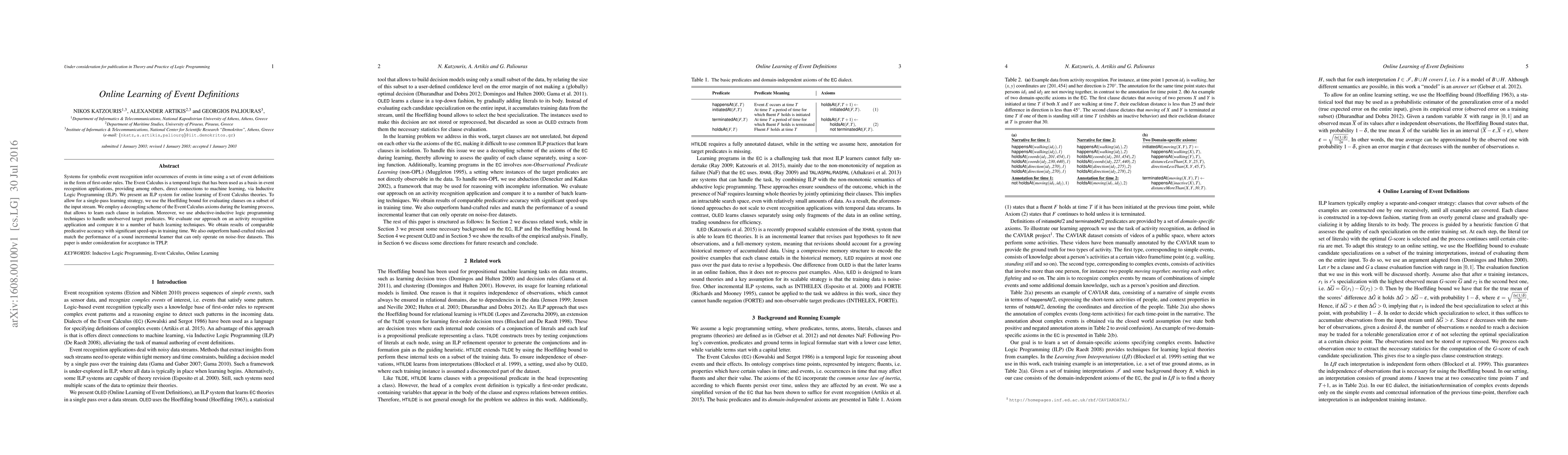 This paper presents an Inductive Logic Programming system for online learning of Event Calculus theories, employing the Hoeffding bound and abductive-inductive logic programming to handle unobserved predicates. The approach achieves comparable predictive accuracy with significant speed-ups compared to batch learning methods.