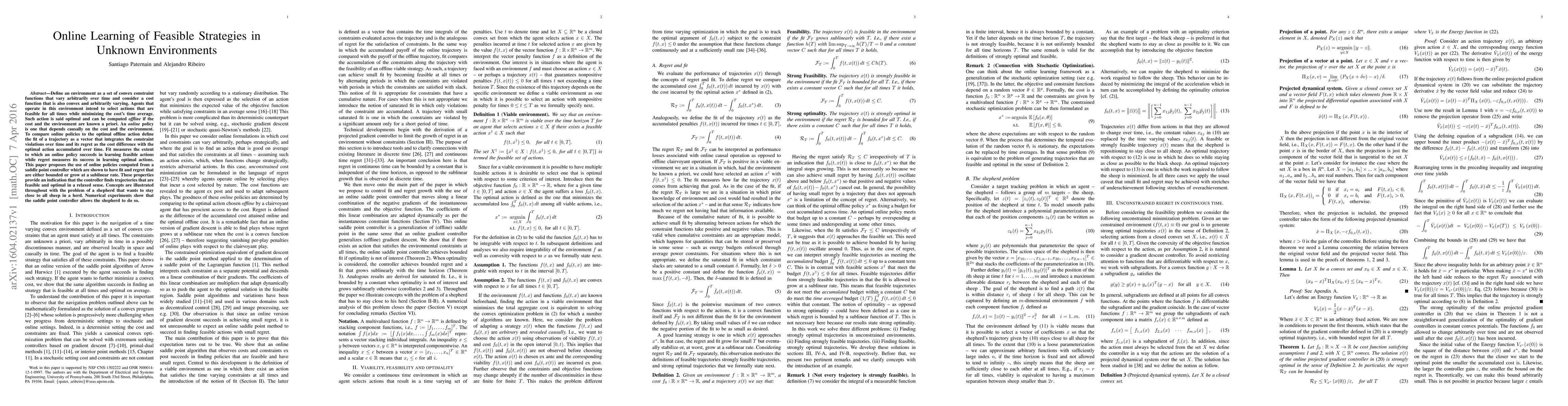 Define an environment as a set of convex constraint functions that vary arbitrarily over time and consider a cost function that is also convex and arbitrarily varying. Agents that operate in this environment intend to select actions that are feasible for all times while minimizing the cost's time average. Such action is said optimal and can be computed offline if the cost and the environment are known a priori. An online policy is one that depends causally on the cost and the environment. To compare online policies to the optimal offline action define the fit of a trajectory as a vector that integrates the constraint violations over time and its regret as the cost difference with the optimal action accumulated over time. Fit measures the extent to which an online policy succeeds in learning feasible actions while regret measures its success in learning optimal actions. This paper proposes the use of online policies computed from a saddle point controller which are shown to have fit and regret that are either bounded or grow at a sublinear rate. These properties provide an indication that the controller finds trajectories that are feasible and optimal in a relaxed sense. Concepts are illustrated throughout with the problem of a shepherd that wants to stay close to all sheep in a herd. Numerical experiments show that the saddle point controller allows the shepherd to do so.