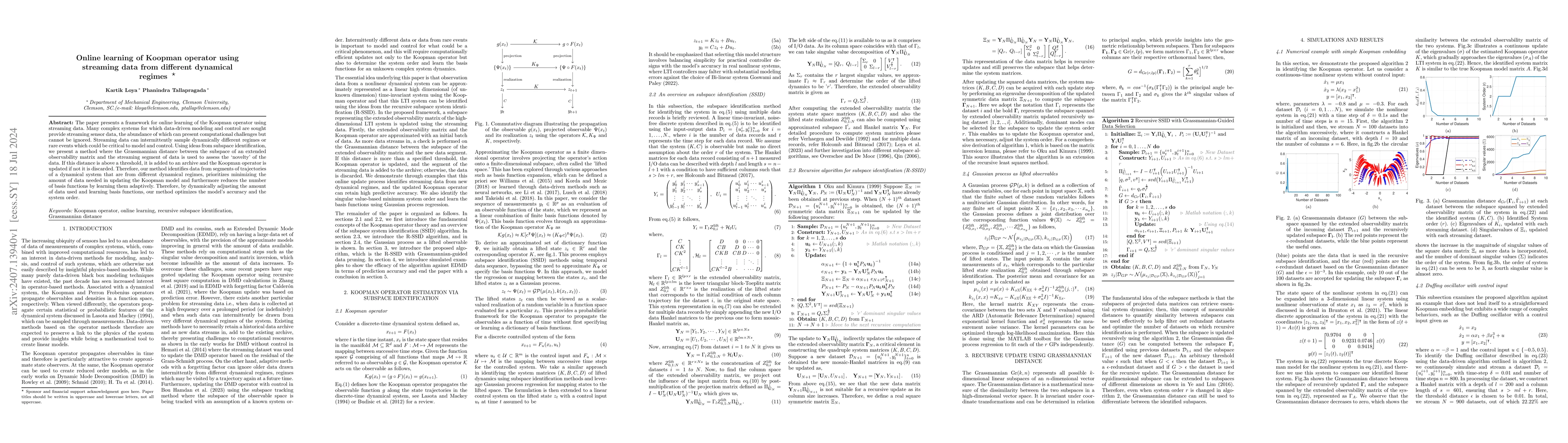 This paper proposes an online learning framework for the Koopman operator using streaming data, leveraging subspace identification and Grassmannian distance to assess data novelty. It prioritizes updating the model with data from different dynamical regimes, adaptively reduces basis functions, and optimizes model accuracy and system order.