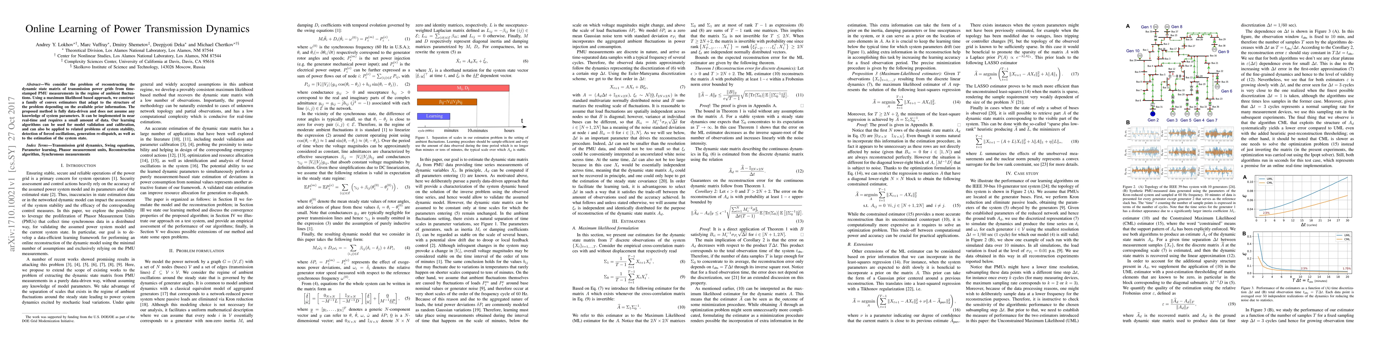 We consider the problem of reconstructing the dynamic state matrix of transmission power grids from time-stamped PMU measurements in the regime of ambient fluctuations. Using a maximum likelihood based approach, we construct a family of convex estimators that adapt to the structure of the problem depending on the available prior information. The proposed method is fully data-driven and does not assume any knowledge of system parameters. It can be implemented in near real-time and requires a small amount of data. Our learning algorithms can be used for model validation and calibration, and can also be applied to related problems of system stability, detection of forced oscillations, generation re-dispatch, as well as to the estimation of the system state.