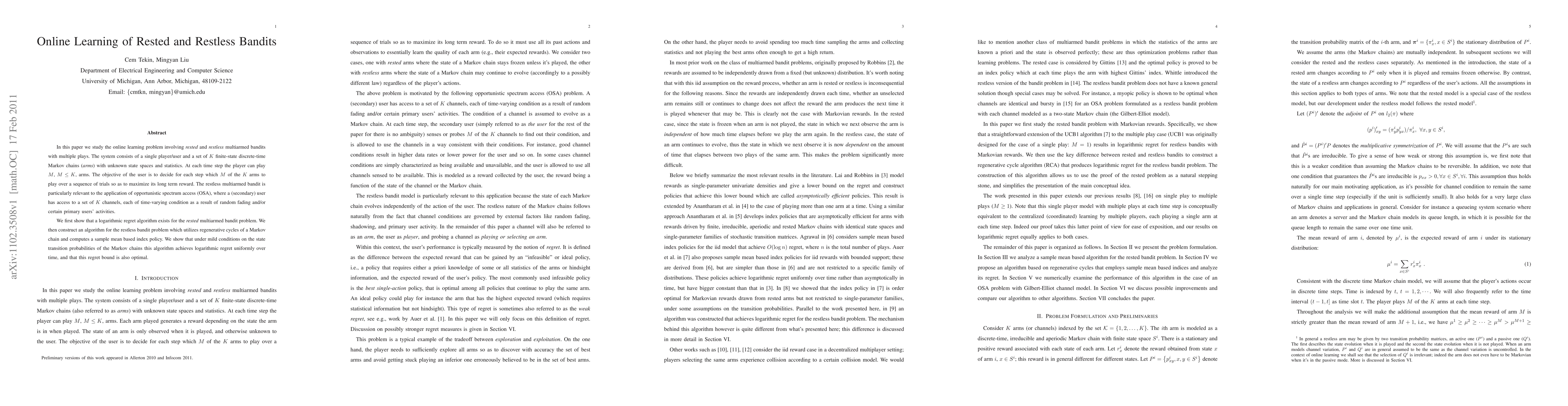 This paper explores online learning strategies for rested and restless multiarmed bandits, focusing on maximizing long-term rewards in a dynamic environment. The approach is particularly relevant for opportunistic spectrum access, where a user selects from time-varying channels affected by fading and primary users.