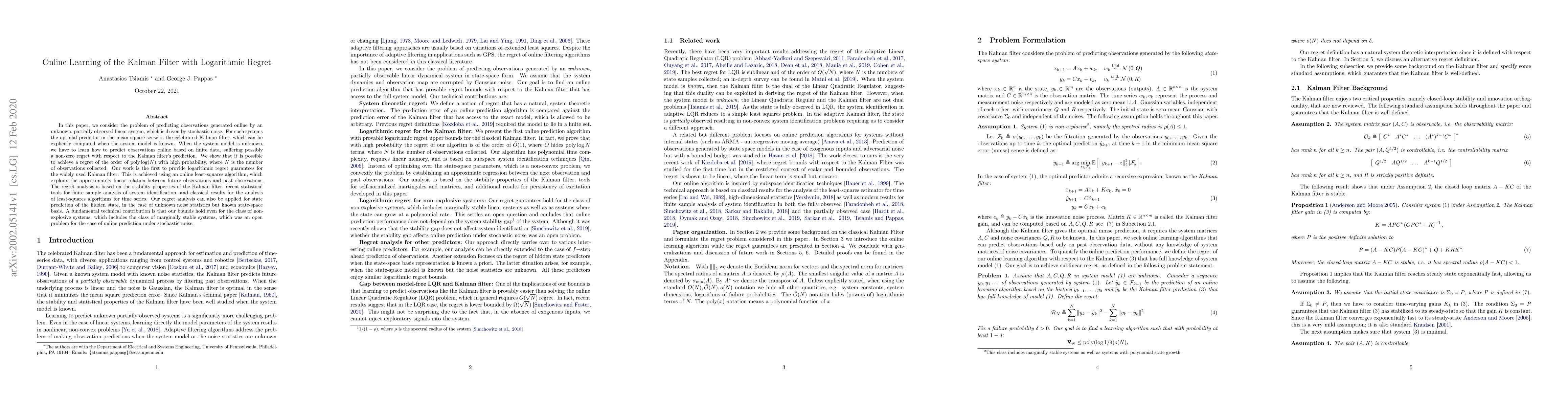 In this paper, we consider the problem of predicting observations generated online by an unknown, partially observed linear system, which is driven by stochastic noise. For such systems the optimal predictor in the mean square sense is the celebrated Kalman filter, which can be explicitly computed when the system model is known. When the system model is unknown, we have to learn how to predict observations online based on finite data, suffering possibly a non-zero regret with respect to the Kalman filter's prediction. We show that it is possible to achieve a regret of the order of $\mathrm{poly}\log(N)$ with high probability, where $N$ is the number of observations collected. Our work is the first to provide logarithmic regret guarantees for the widely used Kalman filter. This is achieved using an online least-squares algorithm, which exploits the approximately linear relation between future observations and past observations. The regret analysis is based on the stability properties of the Kalman filter, recent statistical tools for finite sample analysis of system identification, and classical results for the analysis of least-squares algorithms for time series. Our regret analysis can also be applied for state prediction of the hidden state, in the case of unknown noise statistics but known state-space basis. A fundamental technical contribution is that our bounds hold even for the class of non-explosive systems, which includes the class of marginally stable systems, which was an open problem for the case of online prediction under stochastic noise.