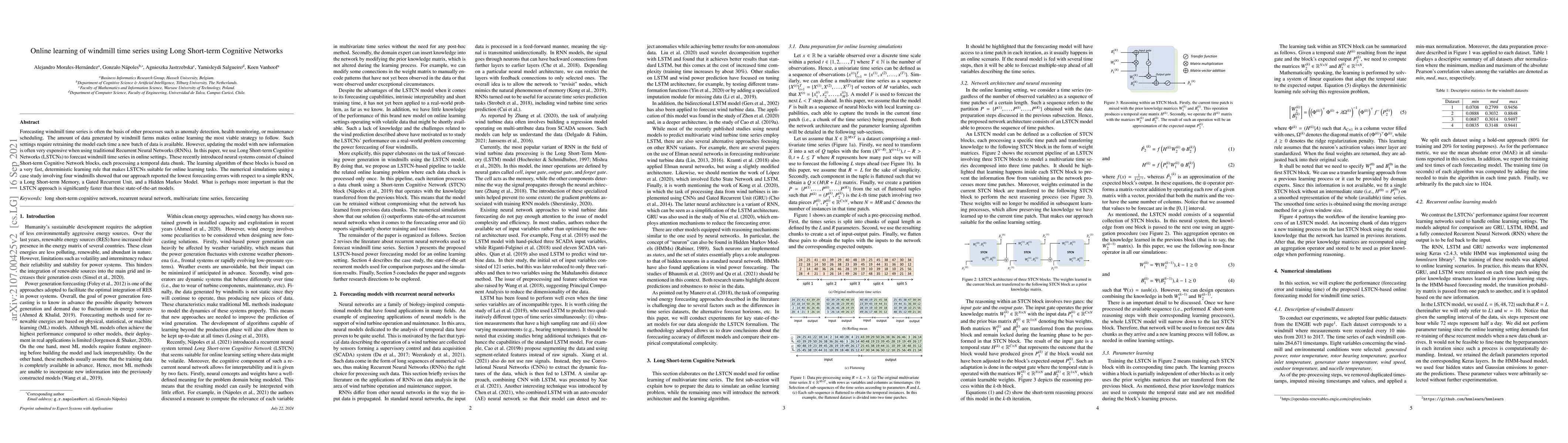 This paper proposes using Long Short-term Cognitive Networks (LSTCNs) for online forecasting of windmill time series, demonstrating lower forecasting errors compared to traditional RNNs and other models. The LSTCN approach is notably faster, making it more suitable for online learning scenarios.