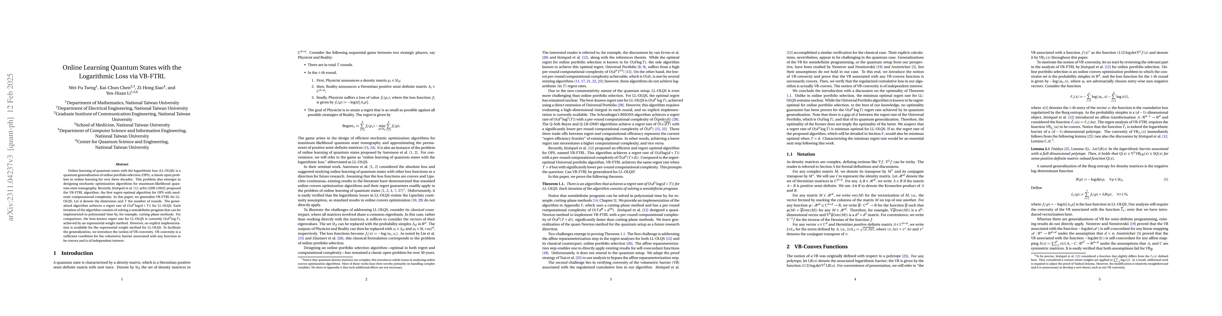Online learning quantum states with the logarithmic loss (LL-OLQS) is a quantum generalization of online portfolio selection, a classic open problem in the field of online learning for over three decades. The problem also emerges in designing randomized optimization algorithms for maximum-likelihood quantum state tomography. Recently, Jezequel et al. (arXiv:2209.13932) proposed the VB-FTRL algorithm, the first nearly regret-optimal algorithm for OPS with moderate computational complexity. In this note, we generalize VB-FTRL for LL-OLQS. Let $d$ denote the dimension and $T$ the number of rounds. The generalized algorithm achieves a regret rate of $O ( d^2 \log ( d + T ) )$ for LL-OLQS. Each iteration of the algorithm consists of solving a semidefinite program that can be implemented in polynomial time by, e.g., cutting-plane methods. For comparison, the best-known regret rate for LL-OLQS is currently $O ( d^2 \log T )$, achieved by the exponential weight method. However, there is no explicit implementation available for the exponential weight method for LL-OLQS. To facilitate the generalization, we introduce the notion of VB-convexity. VB-convexity is a sufficient condition for the logarithmic barrier associated with any function to be convex and is of independent interest.