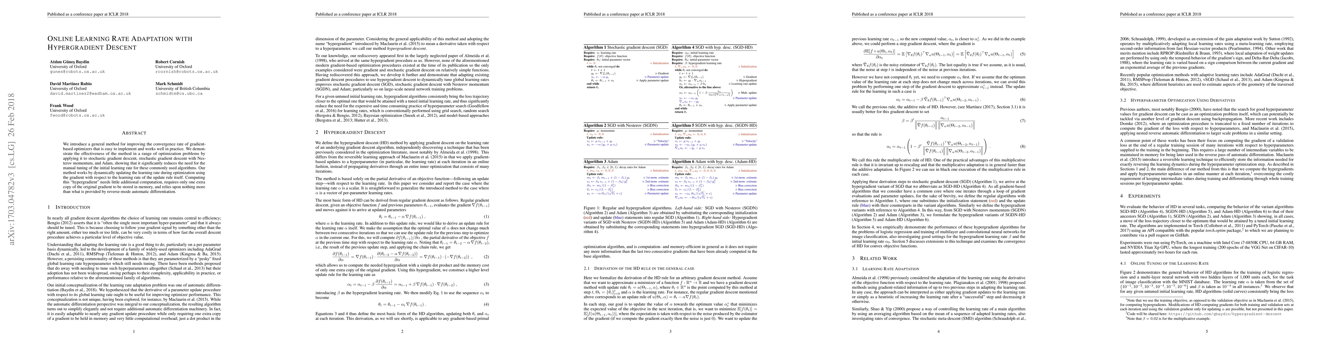 We introduce a general method for improving the convergence rate of gradient-based optimizers that is easy to implement and works well in practice. We demonstrate the effectiveness of the method in a range of optimization problems by applying it to stochastic gradient descent, stochastic gradient descent with Nesterov momentum, and Adam, showing that it significantly reduces the need for the manual tuning of the initial learning rate for these commonly used algorithms. Our method works by dynamically updating the learning rate during optimization using the gradient with respect to the learning rate of the update rule itself. Computing this "hypergradient" needs little additional computation, requires only one extra copy of the original gradient to be stored in memory, and relies upon nothing more than what is provided by reverse-mode automatic differentiation.